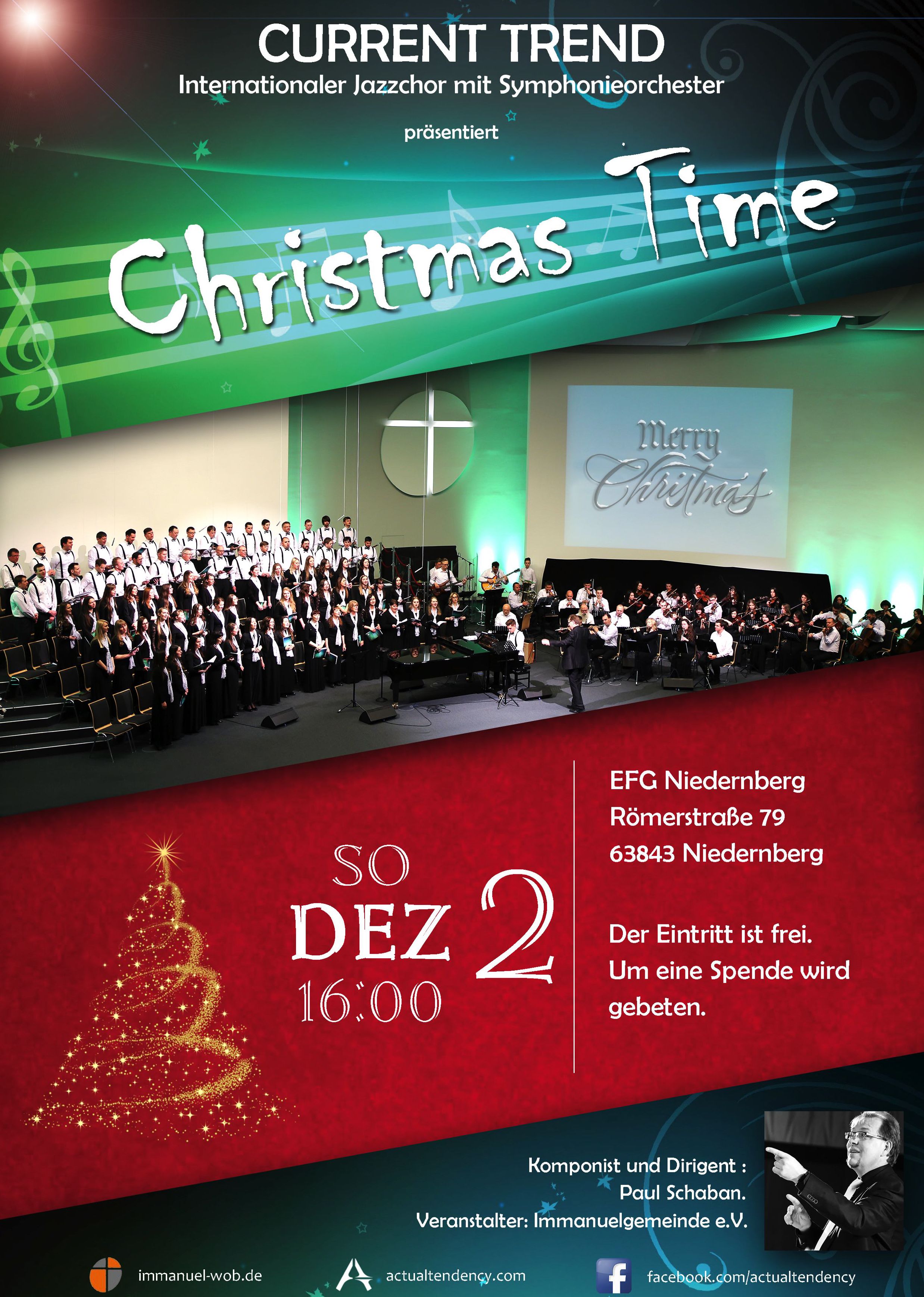 Am 02.12.2018 haben wir in der Christuskirche Niedernberg, Römerstr. 79 in Niedernberg, um 16:00 Uhr das Projekt „Current Trend“, bestehend aus dem internationalen christlichen Jazzchor mit Symphonie Orchester unter der Leitung von Paul Schaban (www.tendenz-positiv.de), zu Gast. Der Eintritt ist frei. Um eine Spende wird gebeten.