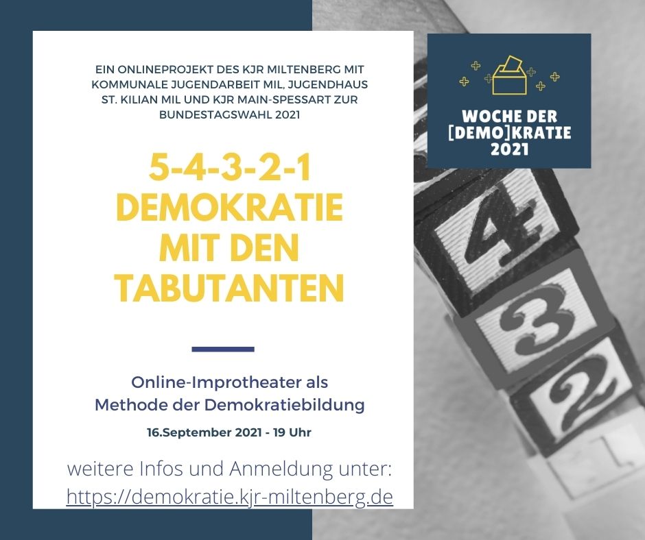 Wir wollen mit diesem Workshop das Thema Demokratie auf eine andere Art beleuchten. Improtheater klappt nur, wenn man mit macht. So ist das auch mit der Demokratie. Wir freuen uns auf einen kurzweiligen Abend mit den TABUTANTEN aus Aschaffenburg.
