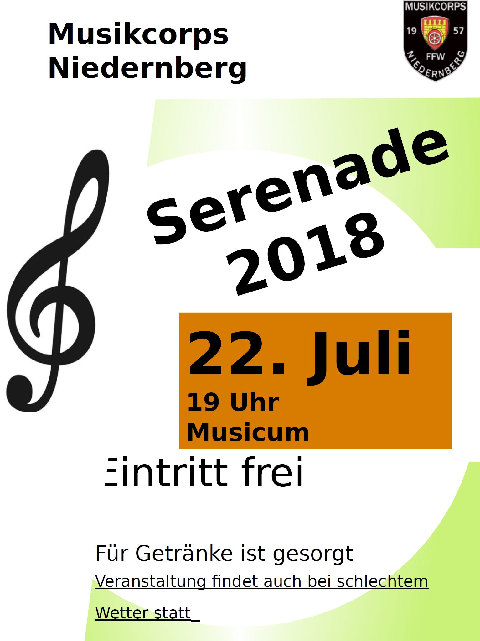 Am 22.07.18 spielt das Musikcorps Niedernberg unter der Leitung seines Dirigenten Thomas Schmitz um 19:00 auf dem Vorplatz des Musicum (Pfarrer-Seubert-Str. 13, Niedernberg) eine Serenade.