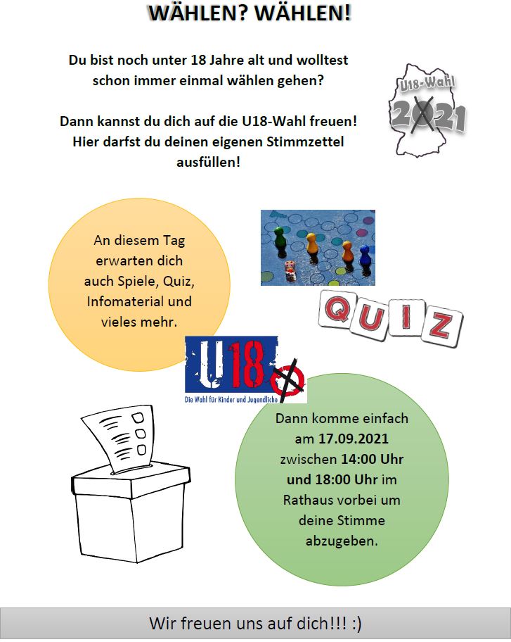 Auch unter 18 darfst du wählen! Komm bei unseren U18-Bundestagswahlen vorbei! Da kannst du deinen eigenen Stimmzettel ausfüllen! Damit sich der Gang ins Wahllokal auch so richtig lohnt, kannst du dich hier längere Zeit aufhalten. Spiele, Quiz, Infomaterial und vieles mehr warten auf dich. Natürlich sind auch alle Erwachsenen herzlich willkommen!
