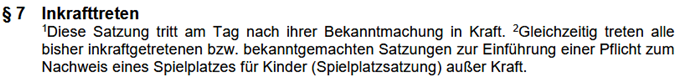Satzung zur Einführung einer Pflicht zum Nachweis eines Spielplatzes für Kinder (Spielplatzsatzung)