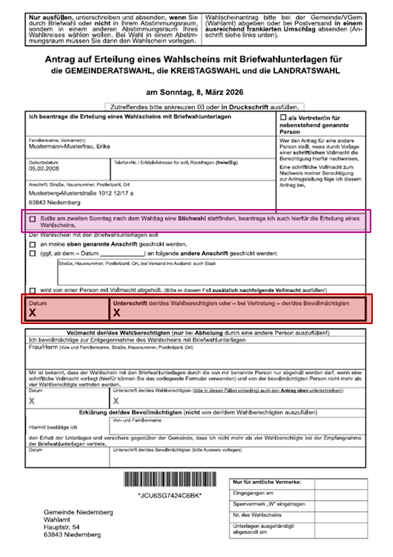 Sie wünschen Briefwahlunterlagen für eine etwaige Landratsstichwahl? Dann das Kreuz nicht vergessen. (Markierung lila)
