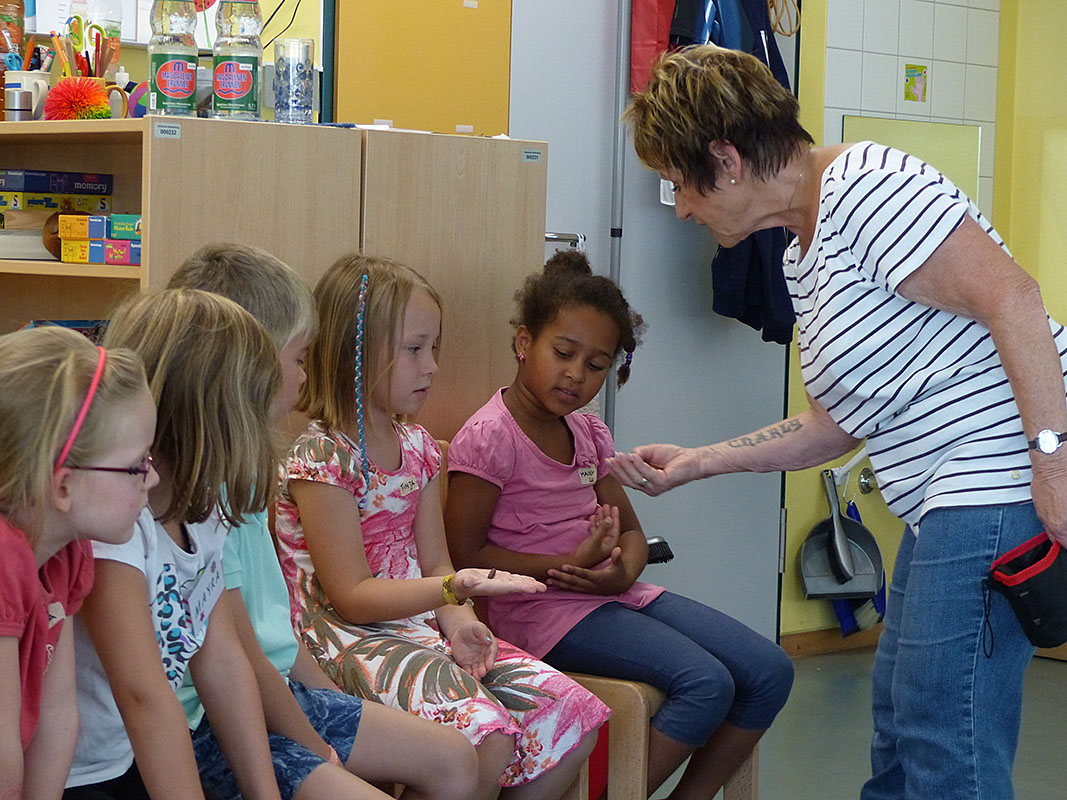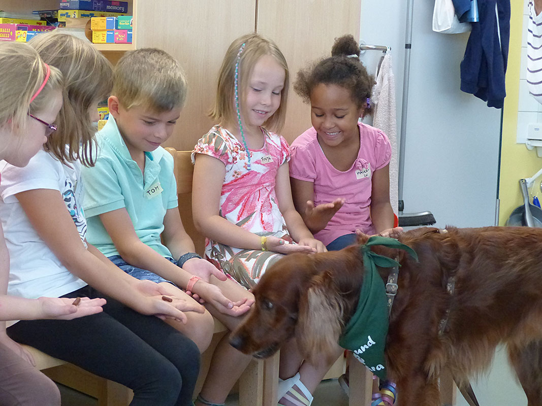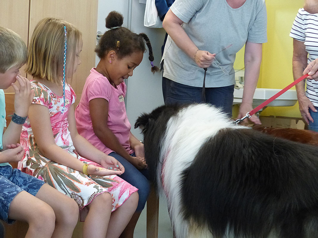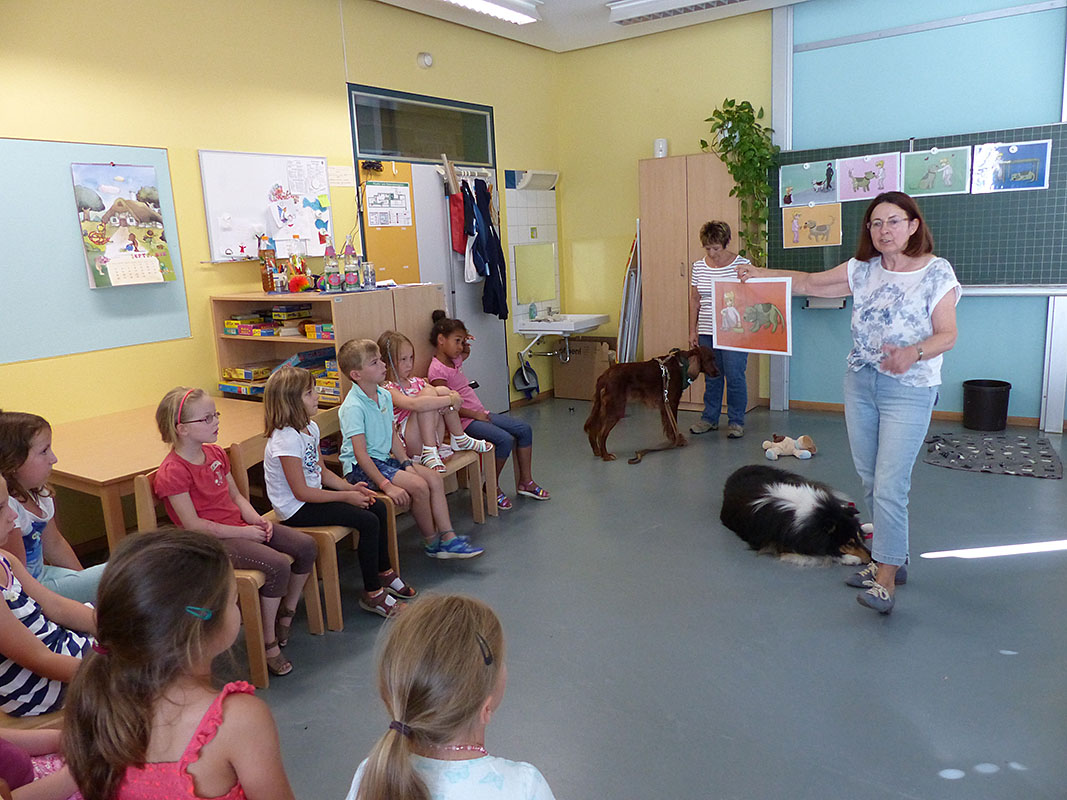 Ihre Kreativität lebten die Kinder auch beim Bedrucken von Taschen aus. Unsere neuen Mittagsbetreuungskinder gestalteten sich ihren eigenen Stoffbeutel mit Namen und Handabdruck und gemeinsam wurden noch vier weitere Taschen kreiert, welche wir am Donnerstag als „Leckerli-Beutel“ unserem außergewöhnlichen Besuch schenken wollten: Juno, Sky, Harvey und Fahra vom Verein „Kind und Hund e.V.“ Gemeinsam mit ihren Frauchen zeigten sie unseren Kindern das richtige Verhalten bei Begegnungen mit Hunden. Durch ihre wesensfeste, ruhige und offene Art schafften es die Tiere augenblicklich, eventuelle Ängste bei den Kindern abzubauen. Gleichzeitig lernten die Kinder, den Hunden Respekt zu zollen. In verschiedenen Rollenspielen wurden potentielle Gefahrensituationen und das richtige Verhalten durchgespielt, um eventuelle Unfälle zu verhüten. Natürlich durfte auch eine Streichel- und Leckerli-Runde nicht fehlen, bei der sich Kind und Hund ausgiebig beschnuppern und Freundschaft schließen konnten.