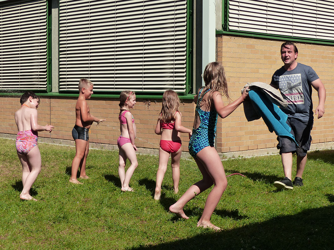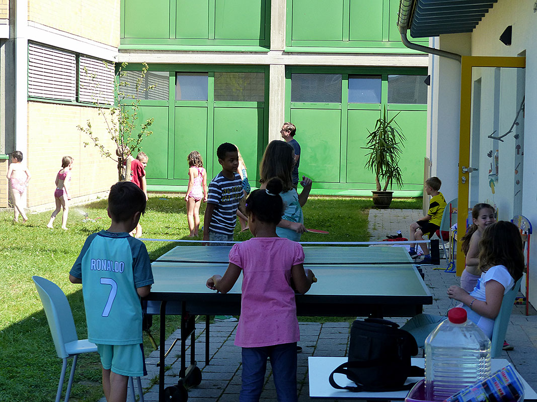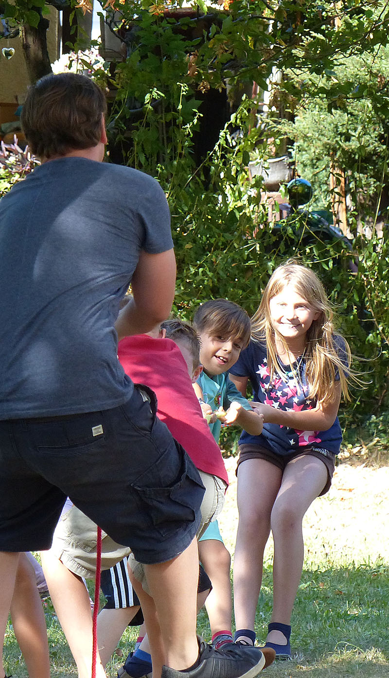 Voller Elan starteten wir mit 41 Kindern in die letzte und zugleich sonnigste Woche der Sommerferien, in der wir uns natürlich viel im Freien aufhielten, wo mit Bewegungs- und Wasserspielen für jeden etwas dabei war. Nach den ersten Kennlern-aktionen, zunächst in kleiner Runde für unsere künftigen Erstklässler, später dann in großer Runde mit allen Kindern und dem Schwungtuch, widmeten wir uns der Zauberei. Eifrig wurden Karten rotiert, Dinge verschwinden lassen und die Gesetze der Schwerkraft überwunden.