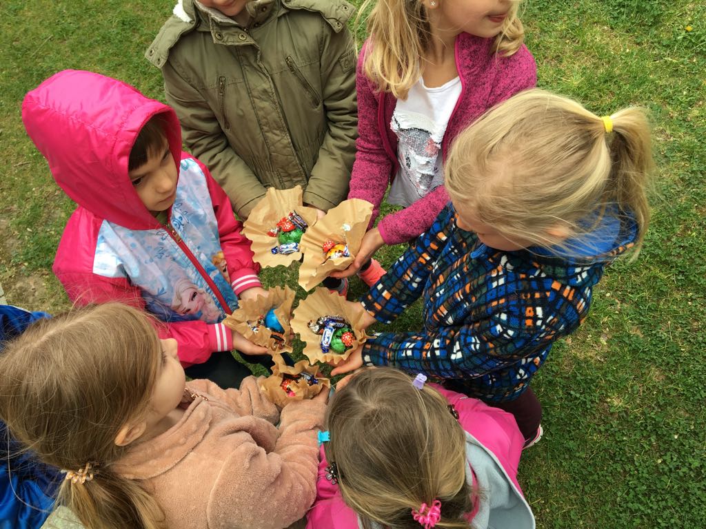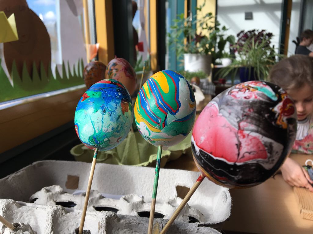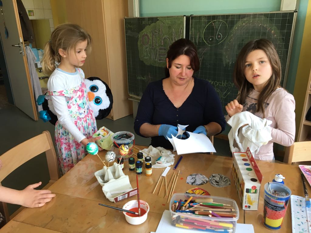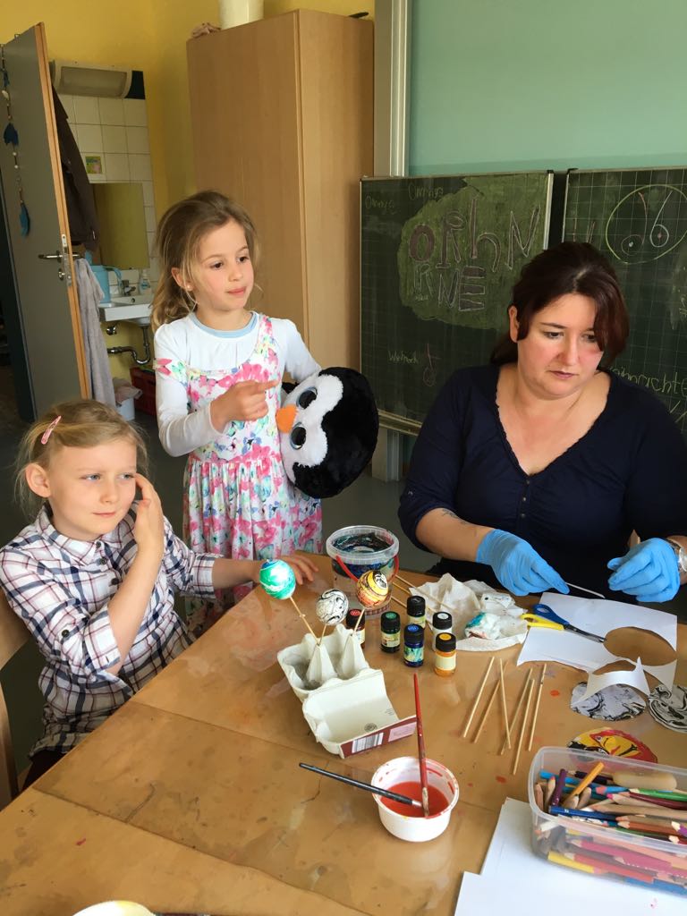 Wir starteten mit 15 Kindern beim gemeinsamen Frühstück gut gelaunt in den Tag. Danach begannen wir die Woche mit dem Basteln von Osterkarten und bemalten die mitgebrachten ausgeblasenen Eier. Am Nachmittag ging es dann bei Sonnenschein ab in unsren Garten. Am Dienstag starteten wir gleich nach dem Frühstück mit einem Spaziergang zum Bootsspielplatz. Beim Schaukeln, Klettern und Fußballspielen konnten sich alle Kinder richtig austoben und es kam keine Langeweile auf. Nach dem Mittagessen wurden die restlichen Eier gefärbt und mit Wasserfarben tolle Osterbilder gezeichnet. Am Mittwochvormittag konnten wir uns Zeit für mitgebrachte Spiele von zuhause nehmen und sie auch ausgiebig testen. Am Nachmittag gab es die Möglichkeit eine Eule aus Holz auszusägen. Die Kinder waren begeistert dabei und konnten sie anschließend bemalen. Die anderen Kinder backte ein Brot für unser Osterfrühstück. Am Donnerstag war es dann soweit, wir hatten unser tolles Osterfrühstück mit selbst gebackenem Brot, frisch aufgeschnittener Rohkost und Kräuterquark, dies kam bei allen sehr gut an. Danach stürmten die Kinder in den Garten, um ihre Osternester zu suchen. Den Nachmittag ließen wir mit Tischspielen ausklingen.