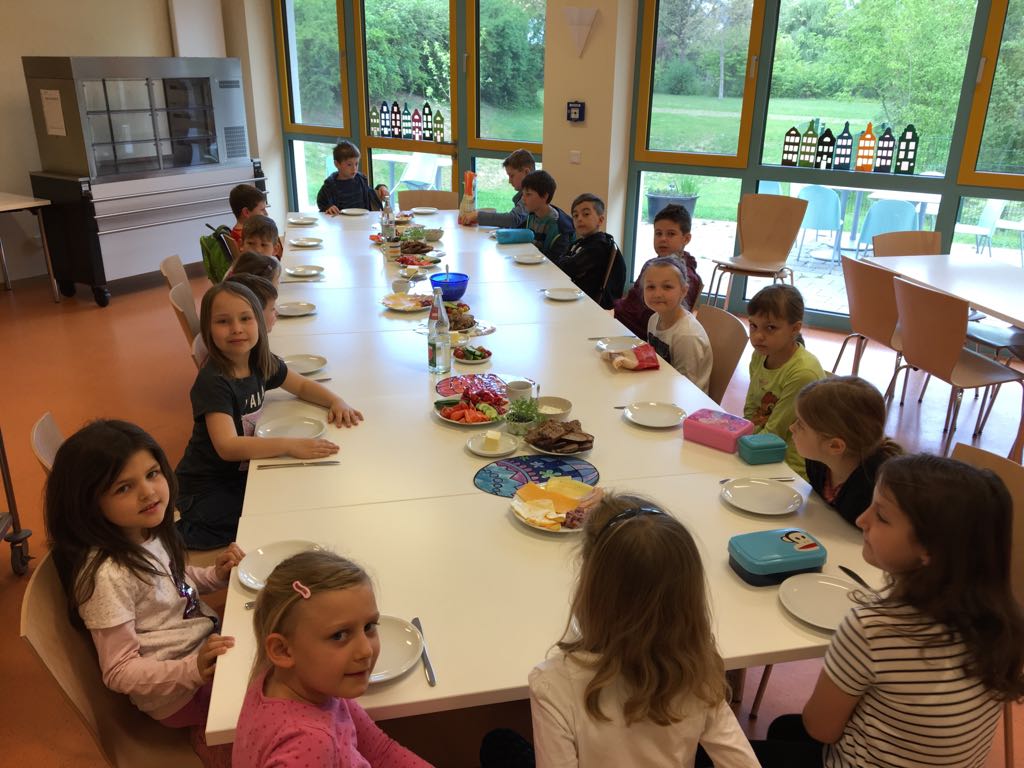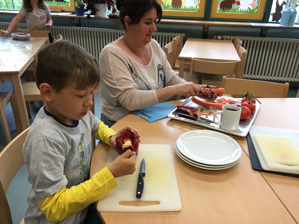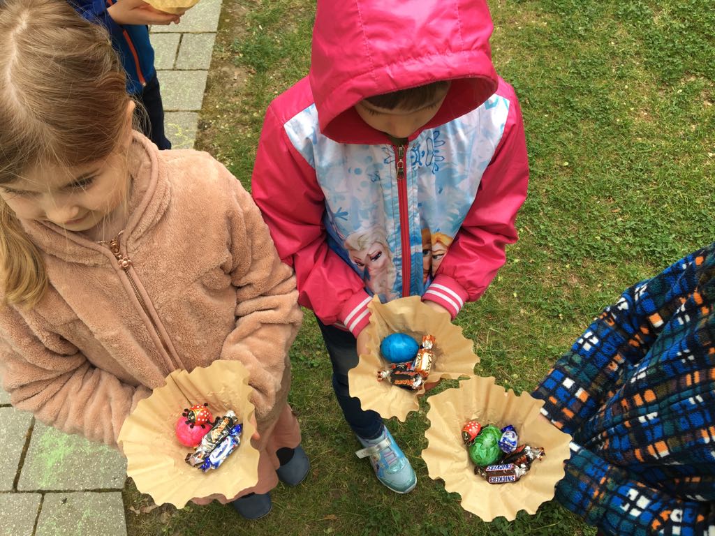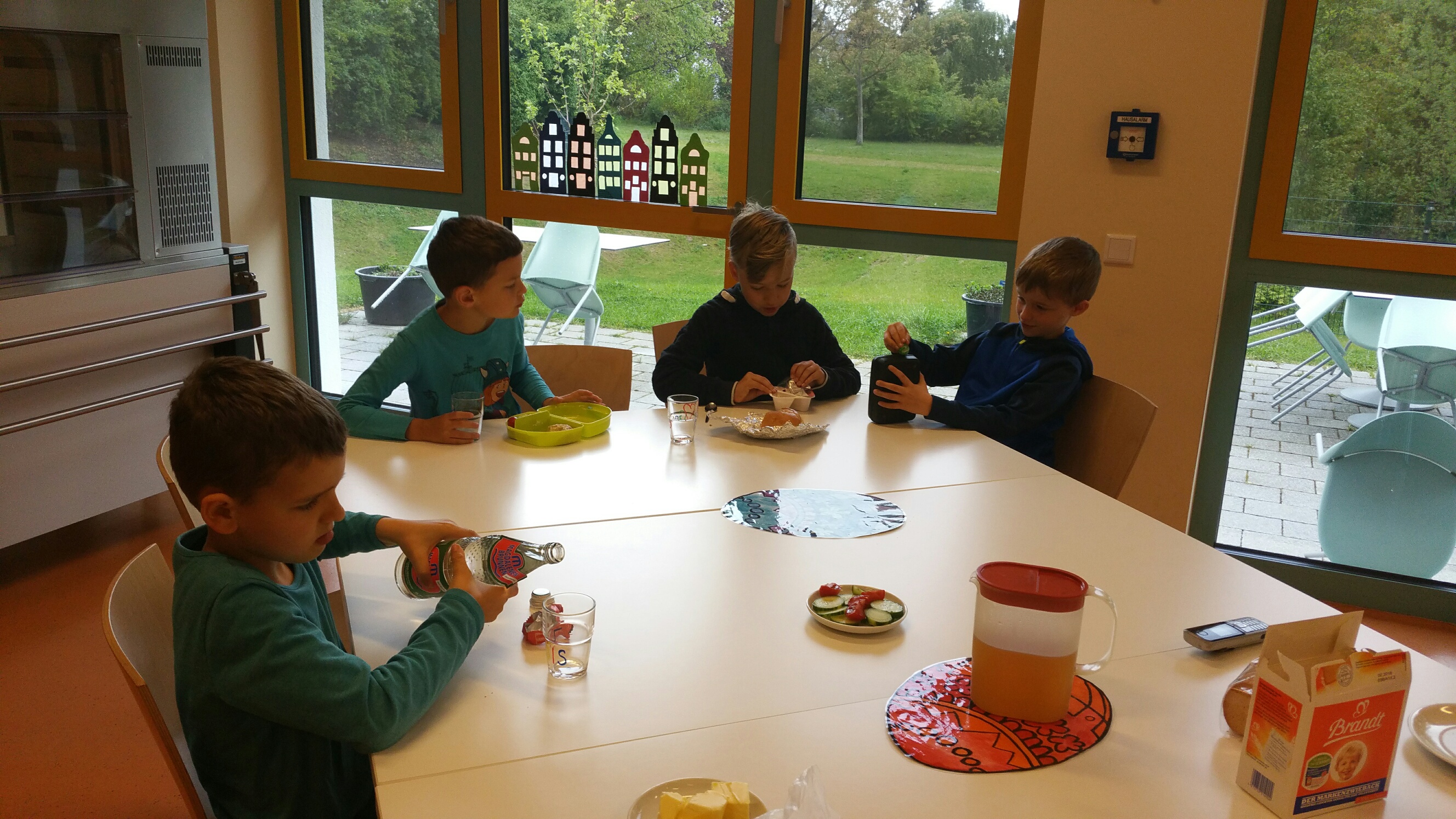 Wir starteten mit 15 Kindern beim gemeinsamen Frühstück gut gelaunt in den Tag. Danach begannen wir die Woche mit dem Basteln von Osterkarten und bemalten die mitgebrachten ausgeblasenen Eier. Am Nachmittag ging es dann bei Sonnenschein ab in unsren Garten. Am Dienstag starteten wir gleich nach dem Frühstück mit einem Spaziergang zum Bootsspielplatz. Beim Schaukeln, Klettern und Fußballspielen konnten sich alle Kinder richtig austoben und es kam keine Langeweile auf. Nach dem Mittagessen wurden die restlichen Eier gefärbt und mit Wasserfarben tolle Osterbilder gezeichnet. Am Mittwochvormittag konnten wir uns Zeit für mitgebrachte Spiele von zuhause nehmen und sie auch ausgiebig testen. Am Nachmittag gab es die Möglichkeit eine Eule aus Holz auszusägen. Die Kinder waren begeistert dabei und konnten sie anschließend bemalen. Die anderen Kinder backte ein Brot für unser Osterfrühstück. Am Donnerstag war es dann soweit, wir hatten unser tolles Osterfrühstück mit selbst gebackenem Brot, frisch aufgeschnittener Rohkost und Kräuterquark, dies kam bei allen sehr gut an. Danach stürmten die Kinder in den Garten, um ihre Osternester zu suchen. Den Nachmittag ließen wir mit Tischspielen ausklingen.