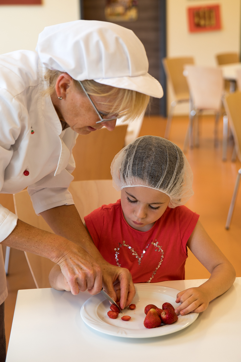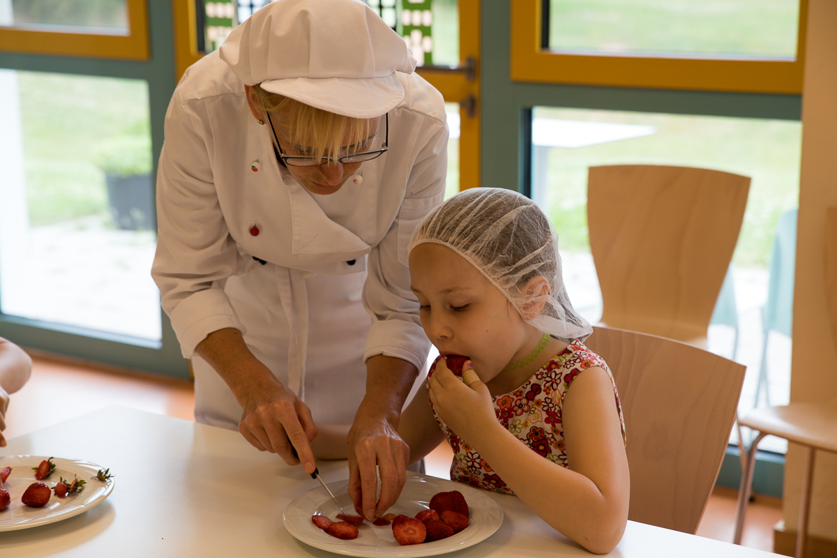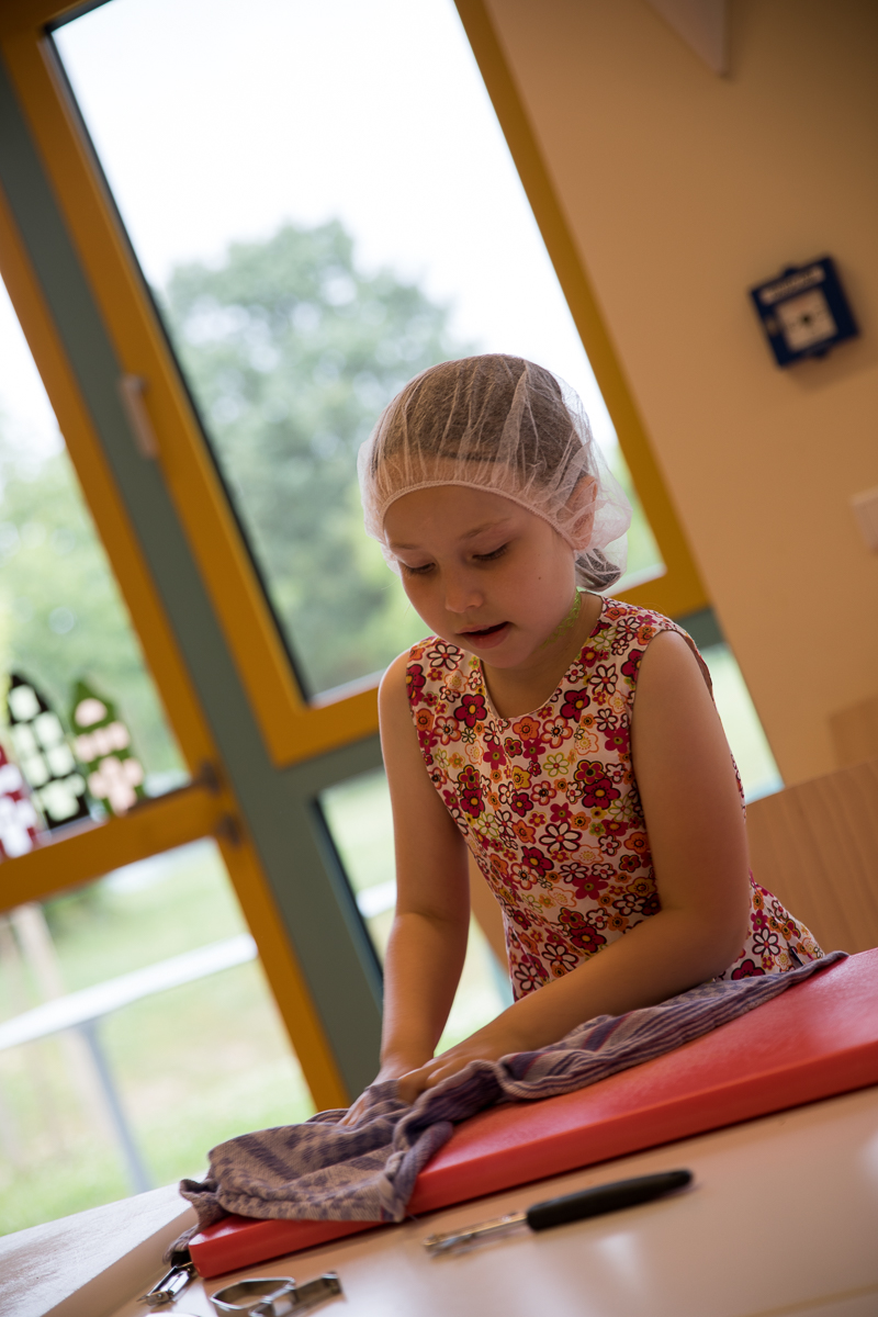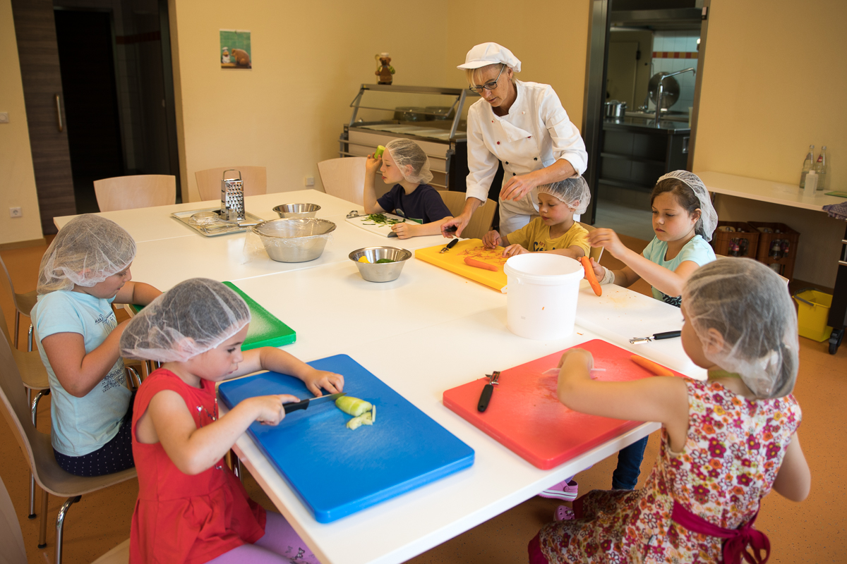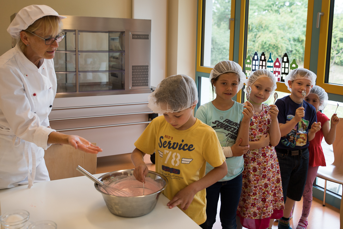 Am Dienstag und am Freitag hatten sie außerdem die Möglichkeit, unserem Mensateam bei der Zubereitung des Mittagessens zu helfen. Am Dienstag wurde eifrig Rohkost zu Gemüsesticks geschnibbelt und ein leckerer Paprika-Joghurt-Dip zubereitet. Unterstützt wurden die Kinder hierbei von unserer Praktikantin Carina, die uns beide Wochen tatkräftig zur Seite stand. Am Freitag bereiteten die Kinder unter der Anleitung von Sybille einen bunten Nudelsalat zu, würfelten Gurken, Möhren und Paprika, mischten das Dressing und schmeckten alles perfekt ab. Anschließend durften sie noch ihre Nachspeise, einen Erdbeerquark aus frischen Erdbeeren zubereiten und dabei natürlich auch Erdbeerstückchen naschen. Am Donnerstag machten wir einen Ausflug mit dem Fahrrad zum See, wo sich alle – Kinder und Betreuer – bei einer heißen Partie Volleyball und am Wasserspielplatz austoben konnten.