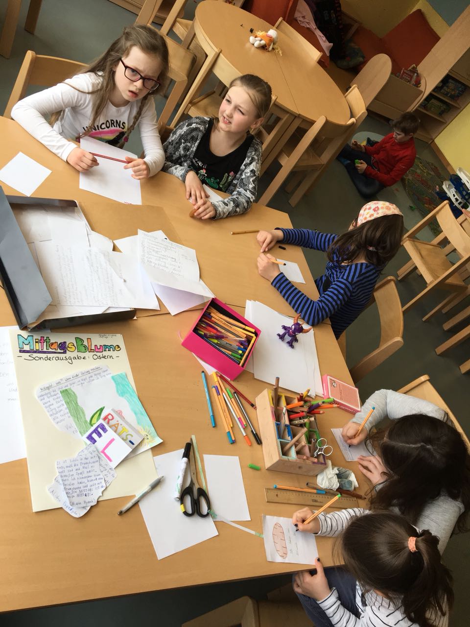Zum Abschluss hielten die Kinder ihre Ferienerlebnisse in der selbst entworfenen Zeitung „MittagsBlume“ fest.
