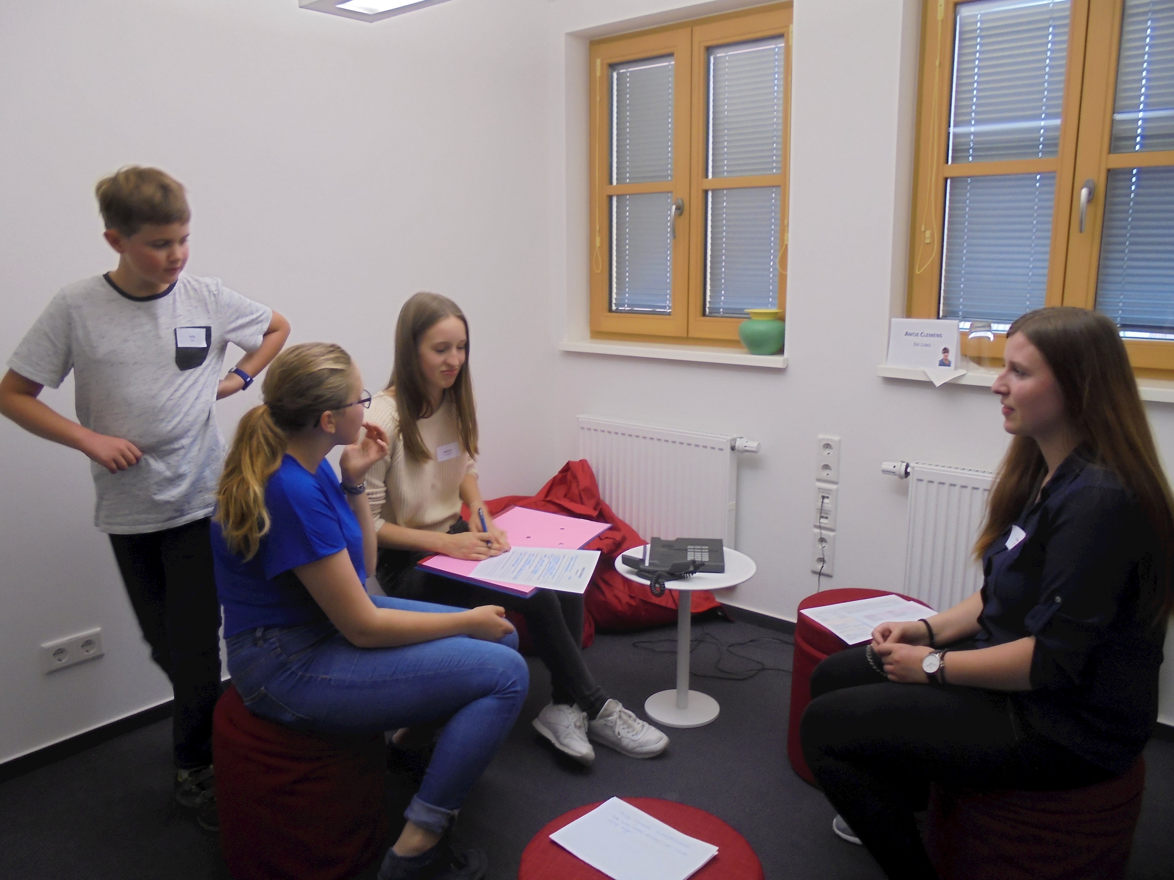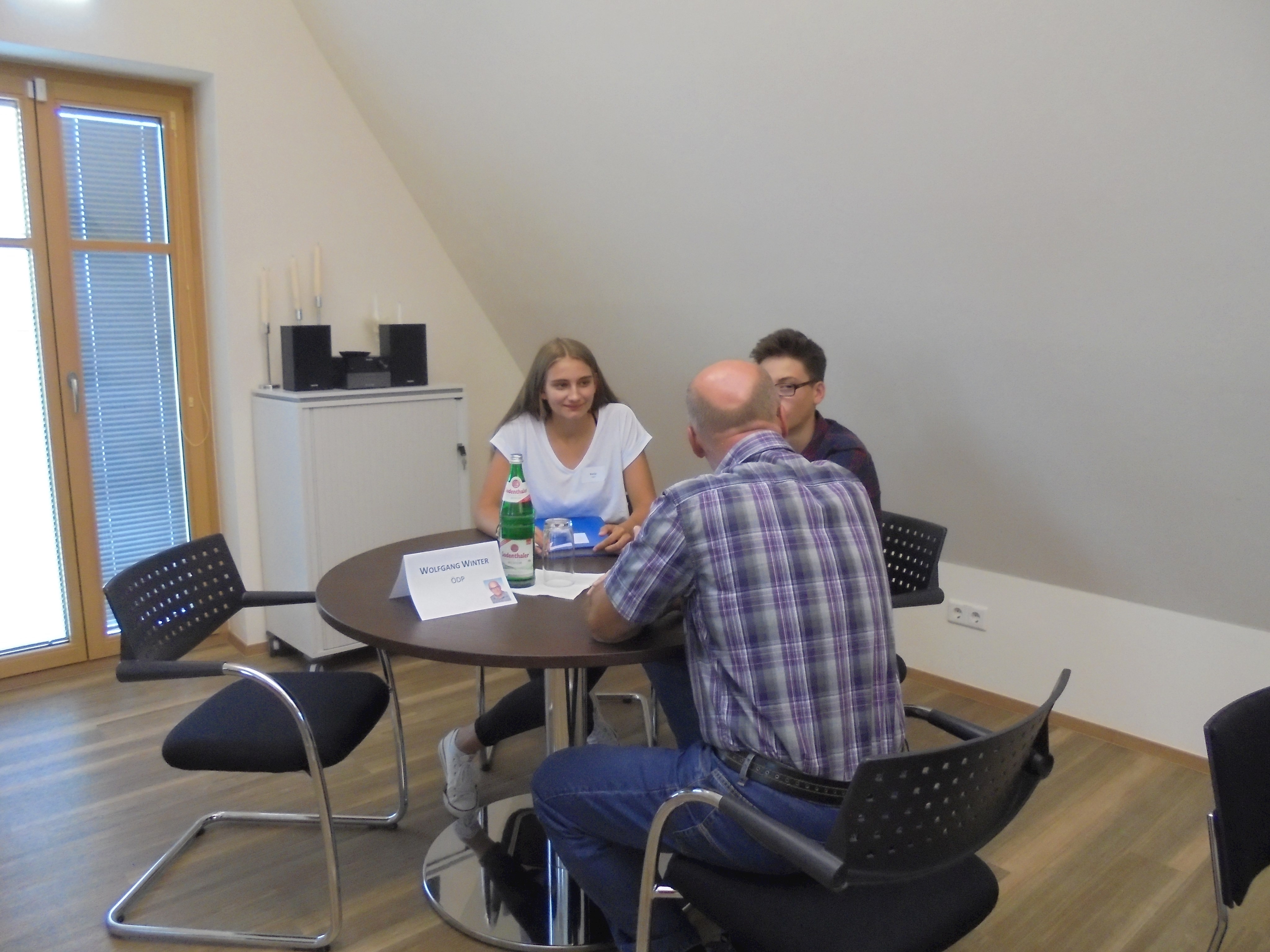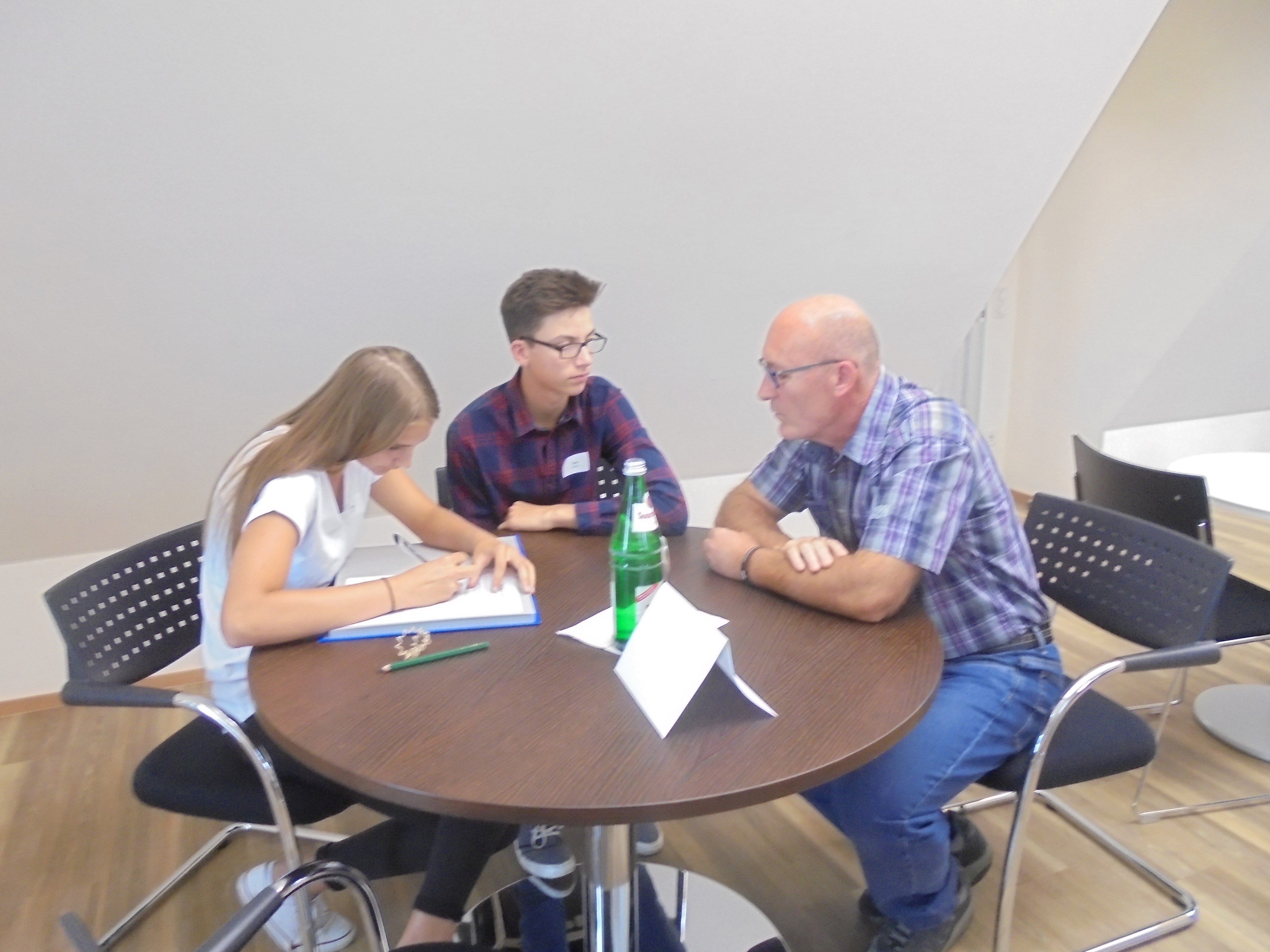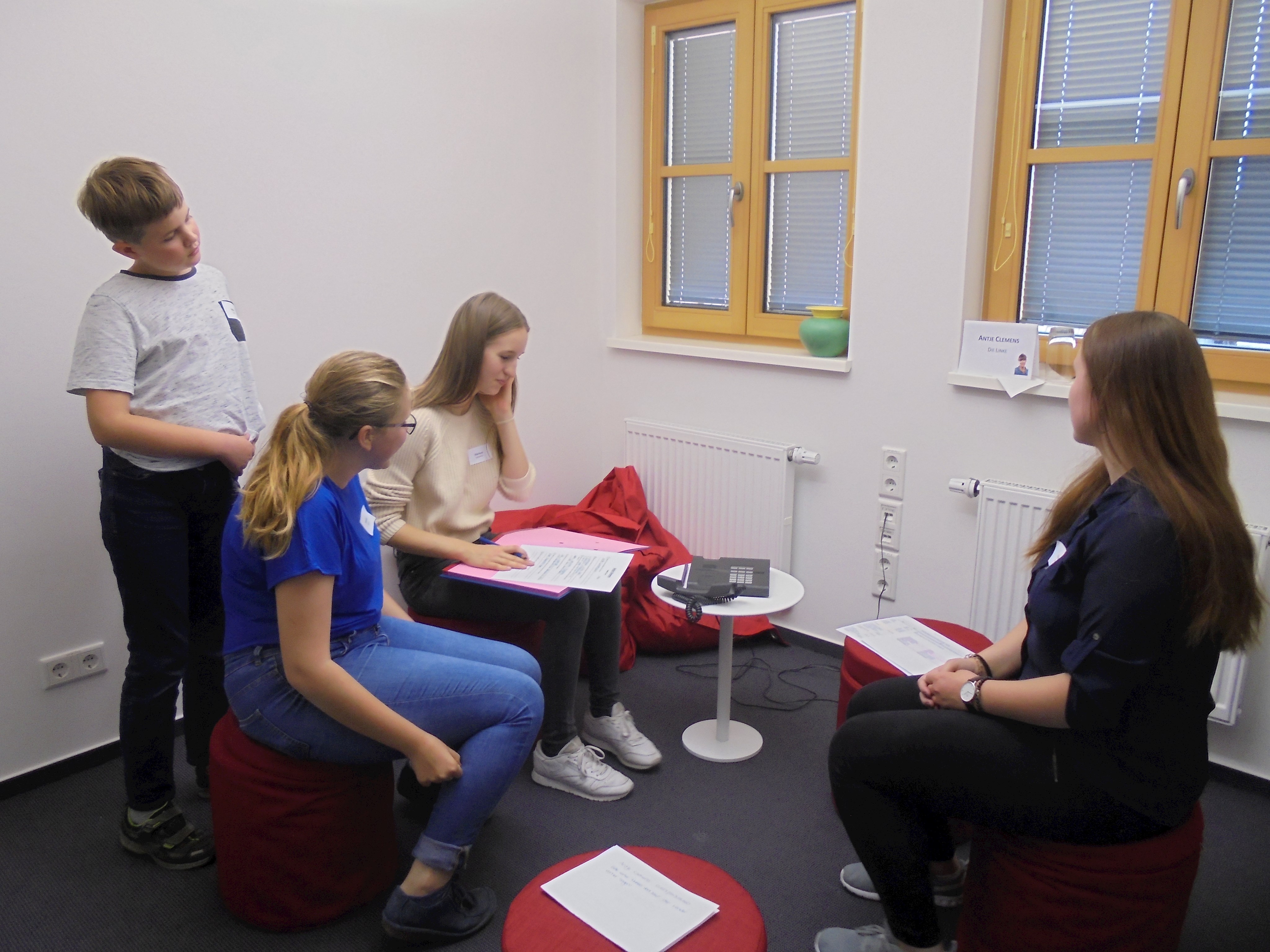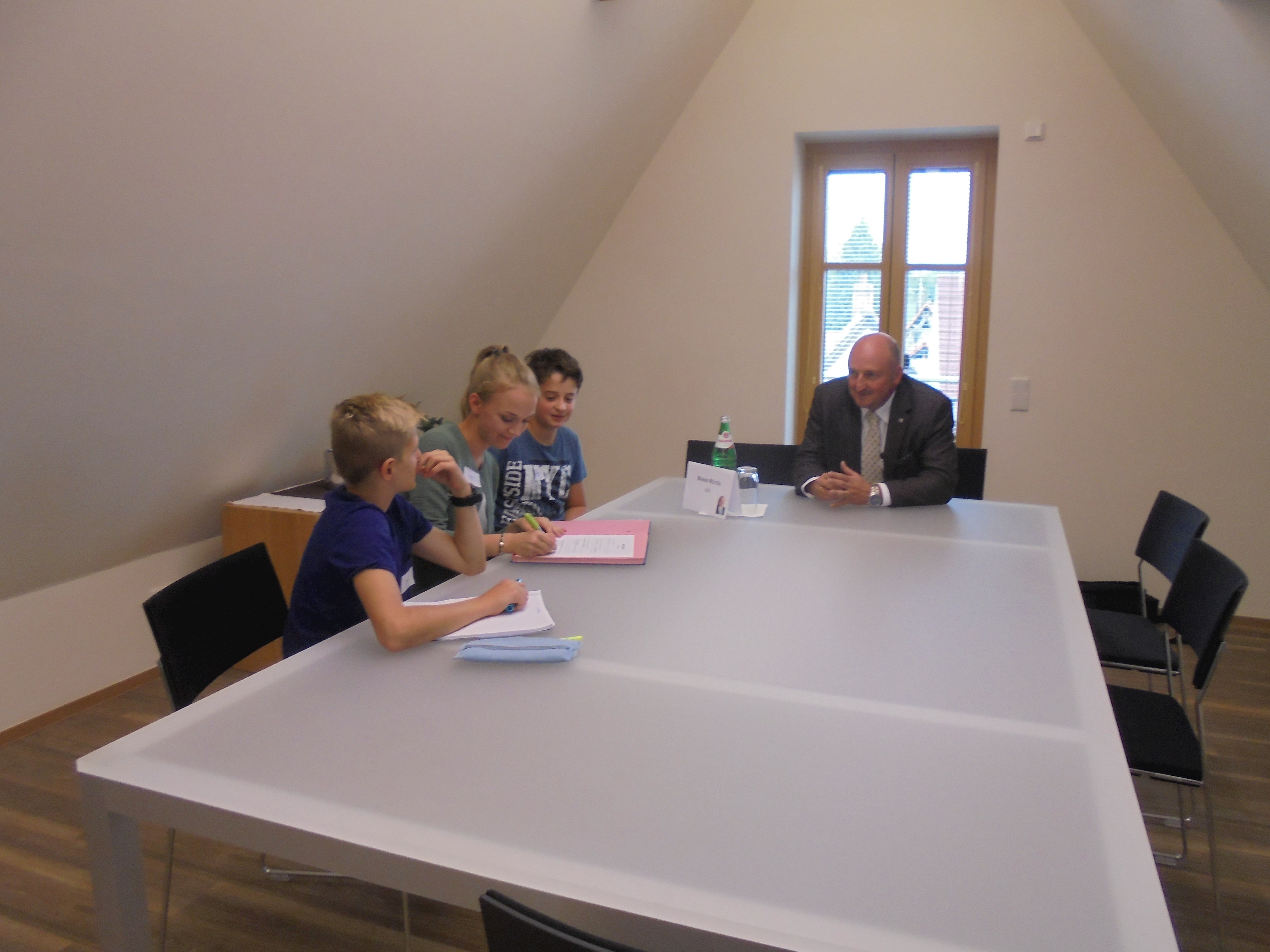Des Weiteren durften alle Kinder und Jugendlichen die Politiker interviewen. Dabei wurden sie in verschiedene Gruppen mit unterschiedlichen Kategorien (Familie, Privatleben, Bundestag, Wahlkampf, Beruf, Politik, Kinder und Jugendliche und Partei) aufgeteilt. Alle Gruppen durften jeden einzelnen Politiker mit ihrem Thema befragen, mit zwei Politikern wurde ein Telefoninterview durchgeführt, da sie leider verhindert waren bzw. die Veranstaltung früher verlassen mussten.