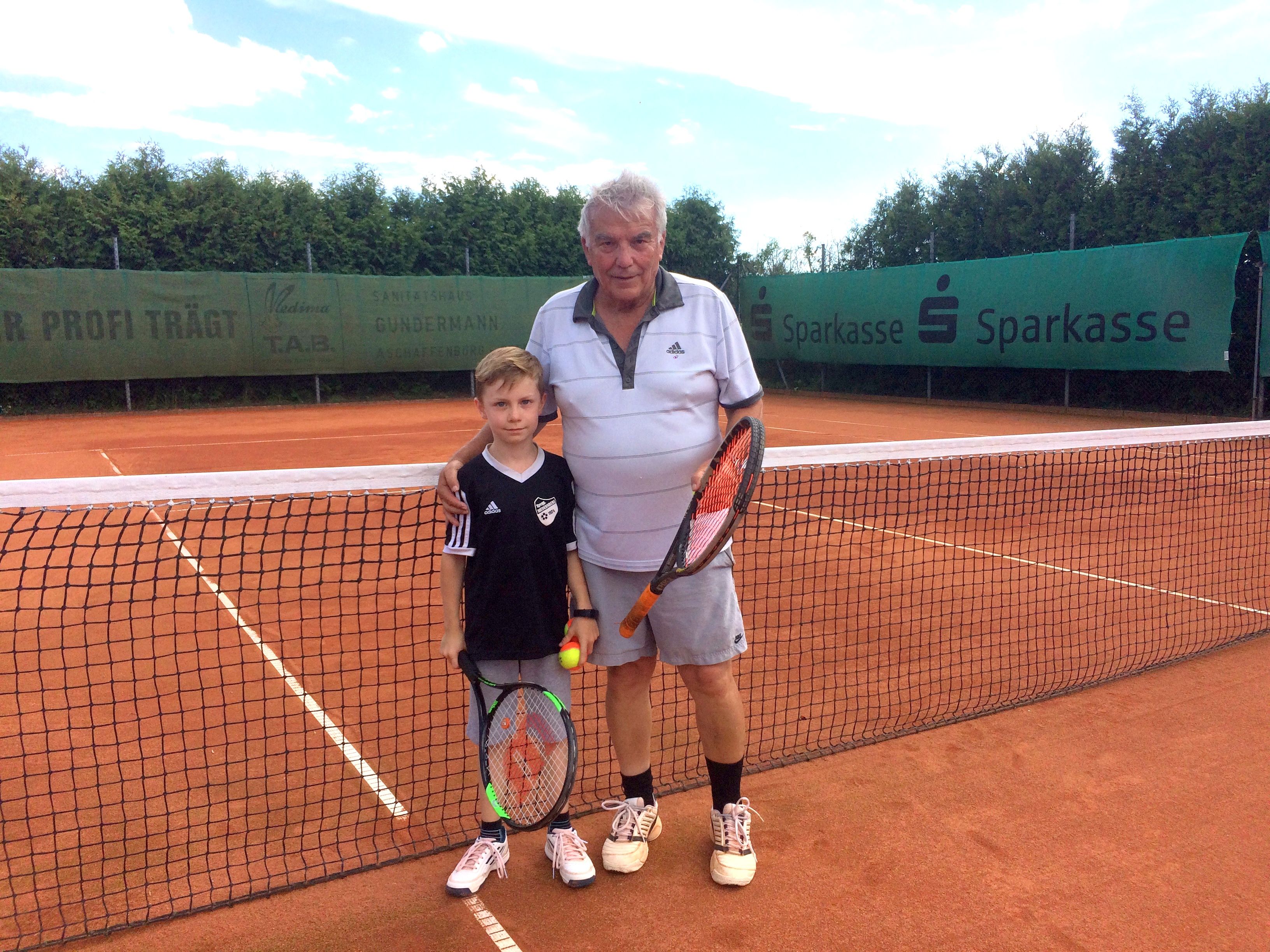 durchgeführt. Im Anschluss daran versuchten sich einige Kinder bei einem ersten Tennismatch. Zu guter Letzt wurden die Teilnehmer durch ein leckeres Eis belohnt. Während des Eisessens, konnten die Kinder ein Trainingspiel zwischen Jung und Alt beobachten. Julian Bott (8 Jahre), unser jüngster aktiver Spieler durfte sich gegen Helmut Gayer (75 Jahre), ältester aktiver Spieler, messen.