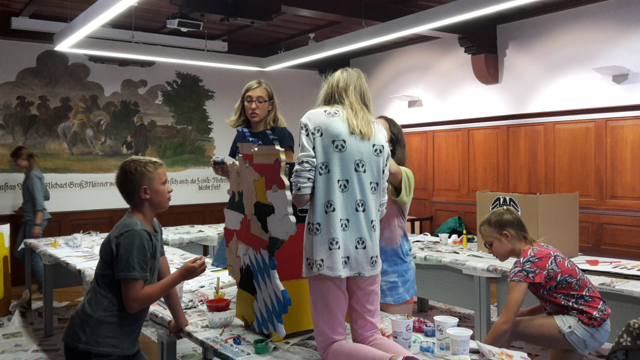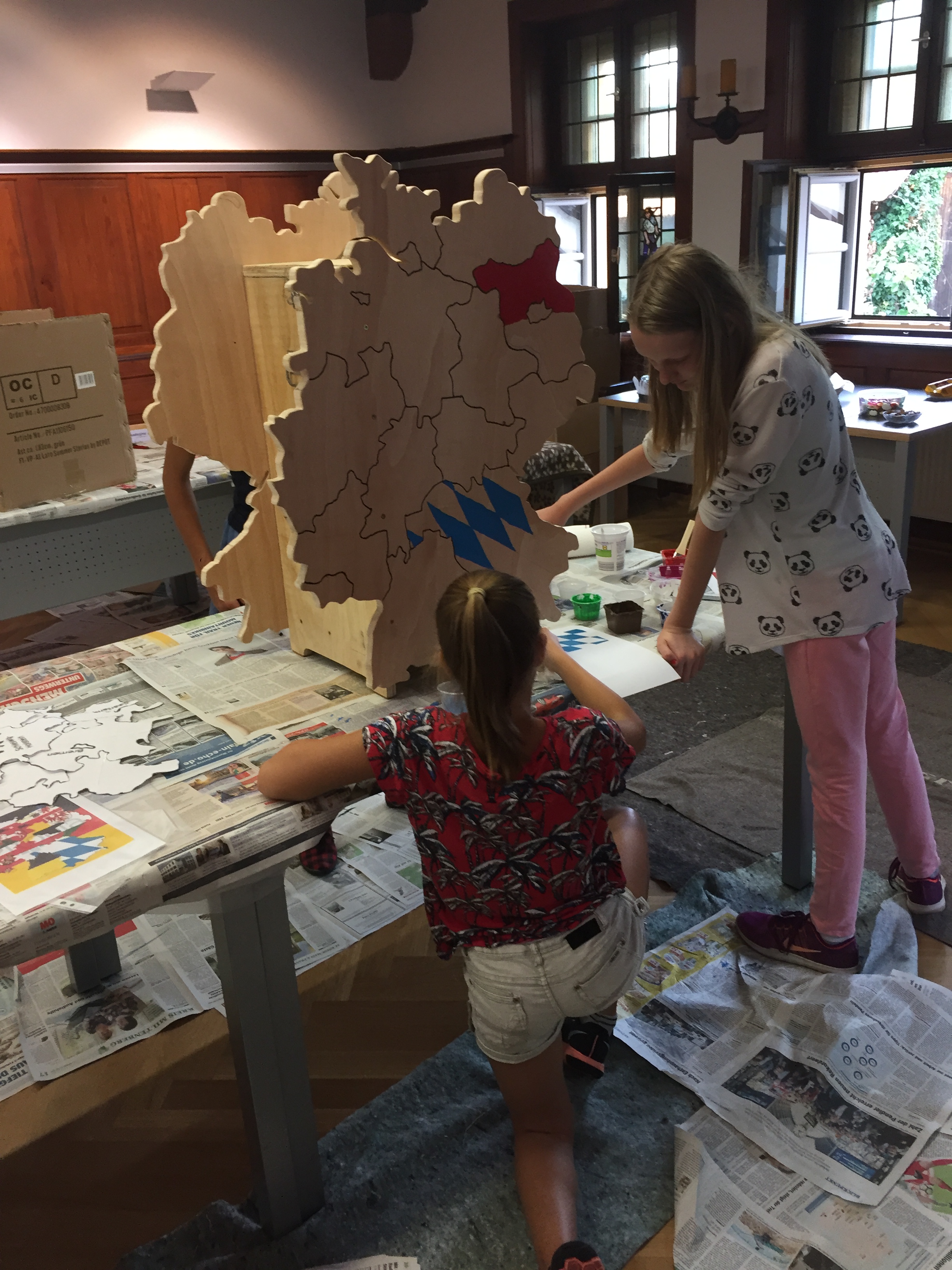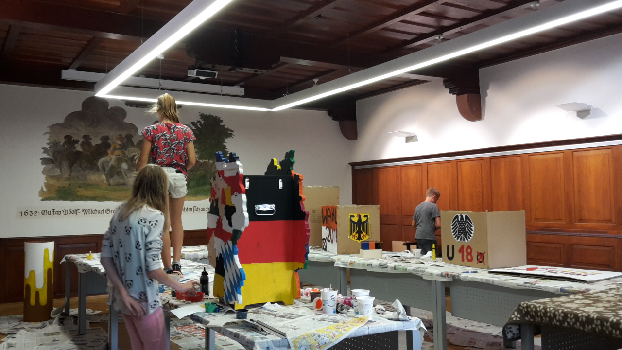 Nach einer kleinen Vorstellungsrunde und einem kurzen Spiel, bei dem die Kinder und Jugendlichen die Bundesländer zu einer Deutschlandkarte zusammenpuzzelten und die Hauptstädte zuordneten, wurde fleißig gebastelt. Gemeinsam gestalteten die Teilnehmer im Rathaus Wahlurnen und Sichtschutze. Jetzt gibt es den Wasserturm als Miniaturausgabe in Form einer Wahlurne! Bei der anderen Wahlurne zeichneten die Teilnehmer die Flaggen und Wappen der Bundesländer auf die Deutschlandkarte und markierten auf der anderen Seite die Bundesländer farbig. Auch die Sichtschutze verzierten die Teilnehmer mit Bildern und Texten. Die gestalteten Wahlurnen und Sichtschutze werden an der U18-Wahl zum Einsatz kommen. Weiterhin durften sich die Teilnehmer einen Entwurf für die Wahlbenachrichtigungskarte aussuchen, die an alle Niedernberger Kinder und Jugendlichen zwischen sechs und 18 Jahren verschickt wird.