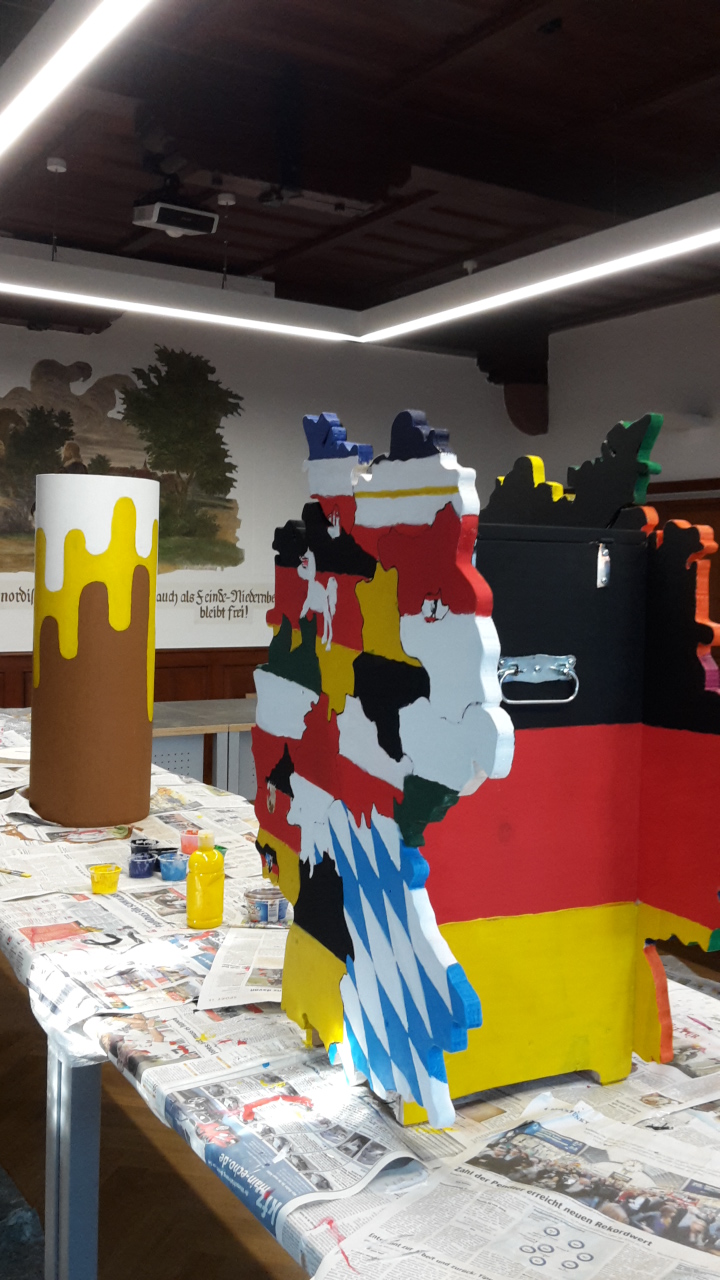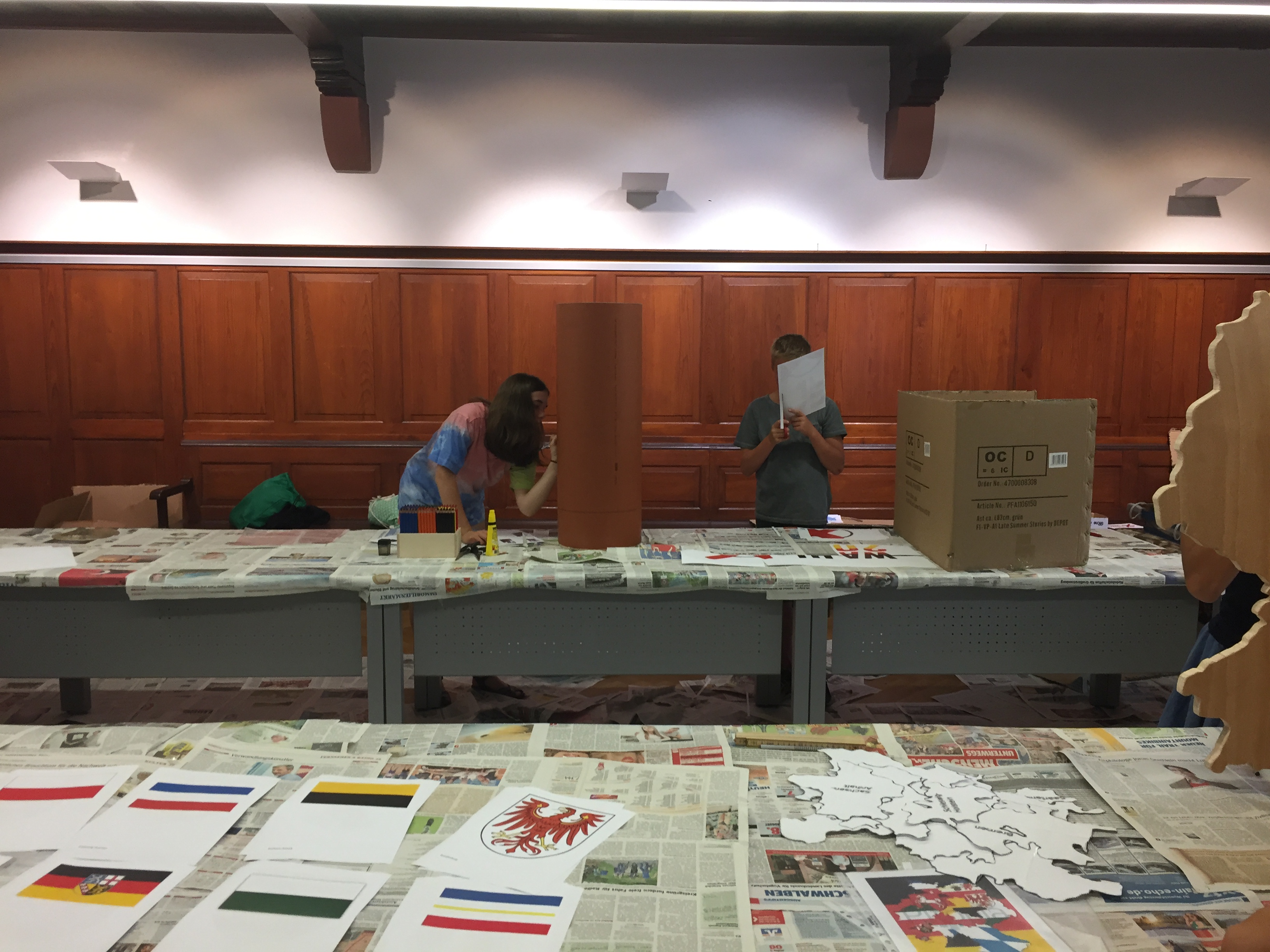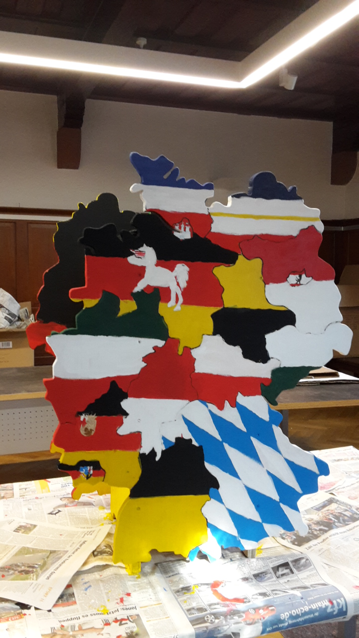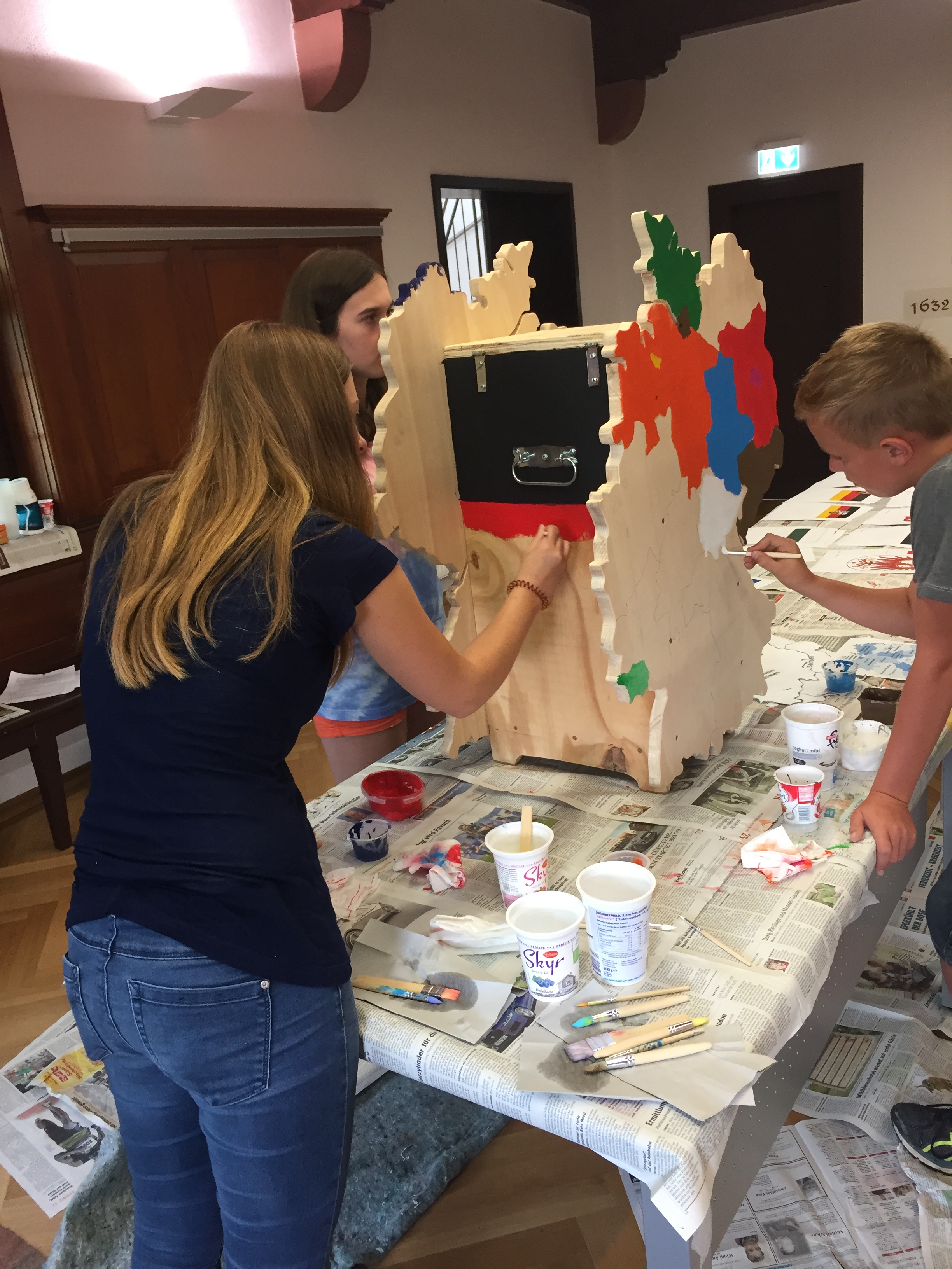 Nach einer kleinen Vorstellungsrunde und einem kurzen Spiel, bei dem die Kinder und Jugendlichen die Bundesländer zu einer Deutschlandkarte zusammenpuzzelten und die Hauptstädte zuordneten, wurde fleißig gebastelt. Gemeinsam gestalteten die Teilnehmer im Rathaus Wahlurnen und Sichtschutze. Jetzt gibt es den Wasserturm als Miniaturausgabe in Form einer Wahlurne! Bei der anderen Wahlurne zeichneten die Teilnehmer die Flaggen und Wappen der Bundesländer auf die Deutschlandkarte und markierten auf der anderen Seite die Bundesländer farbig. Auch die Sichtschutze verzierten die Teilnehmer mit Bildern und Texten. Die gestalteten Wahlurnen und Sichtschutze werden an der U18-Wahl zum Einsatz kommen. Weiterhin durften sich die Teilnehmer einen Entwurf für die Wahlbenachrichtigungskarte aussuchen, die an alle Niedernberger Kinder und Jugendlichen zwischen sechs und 18 Jahren verschickt wird.