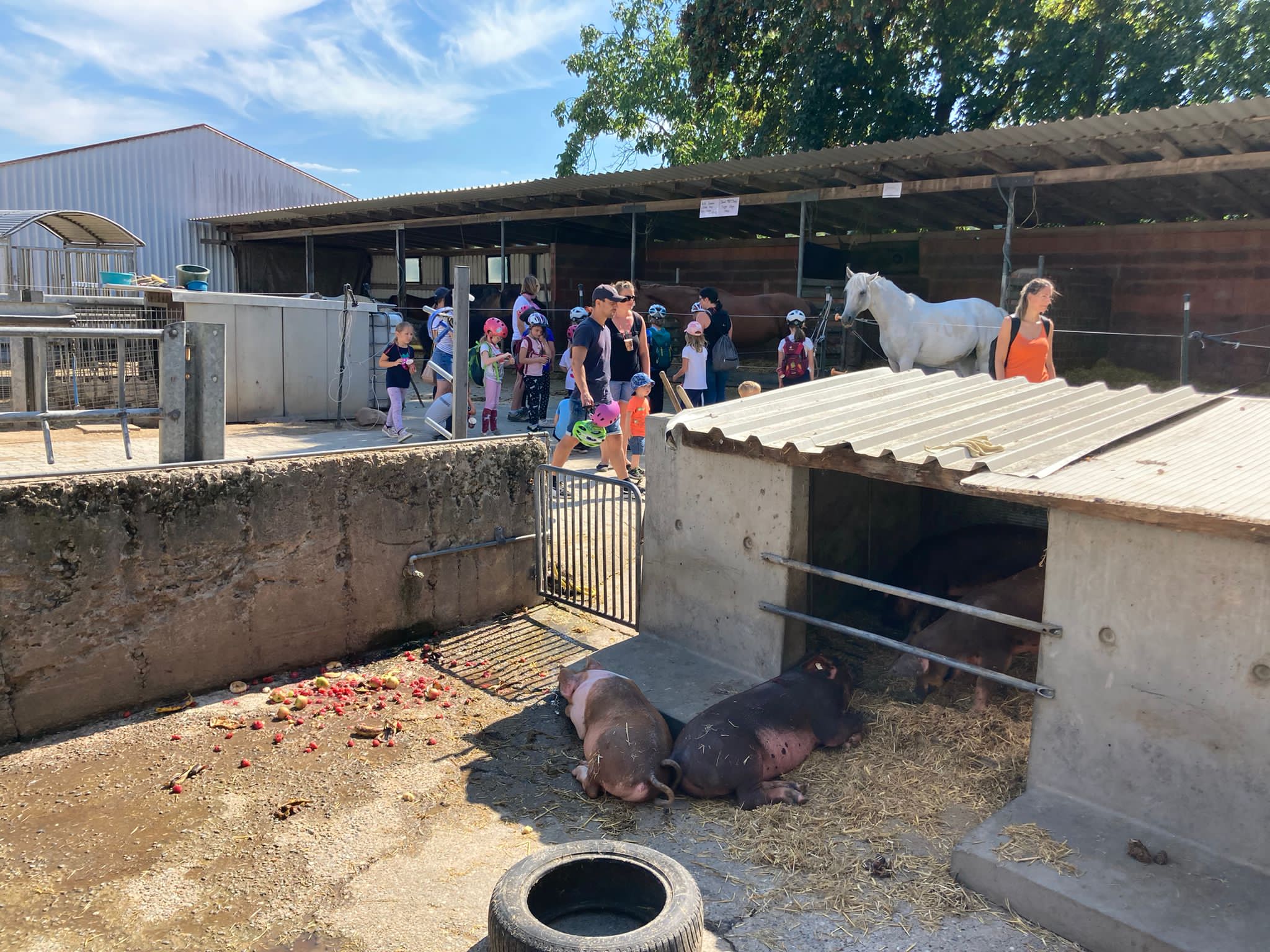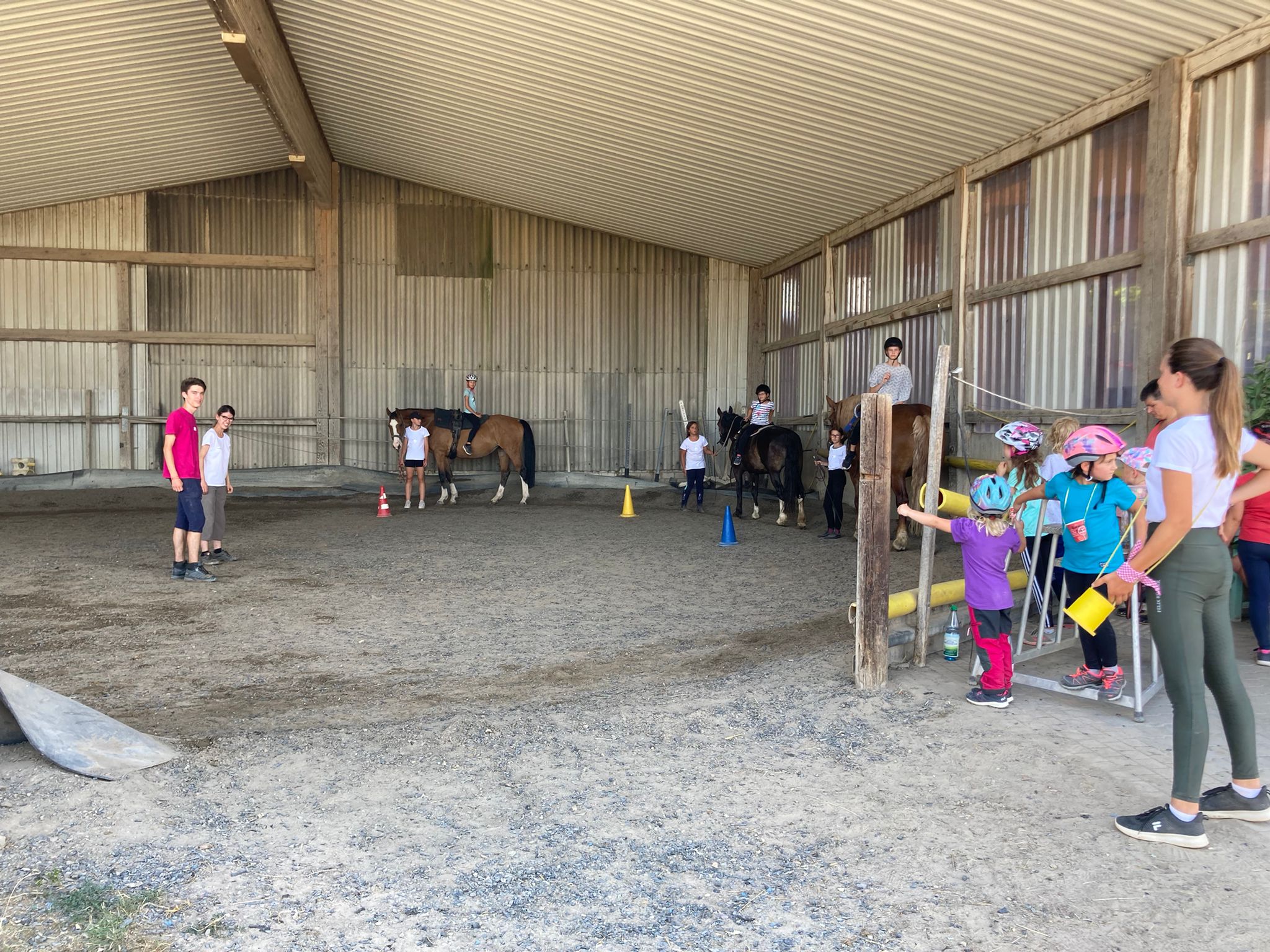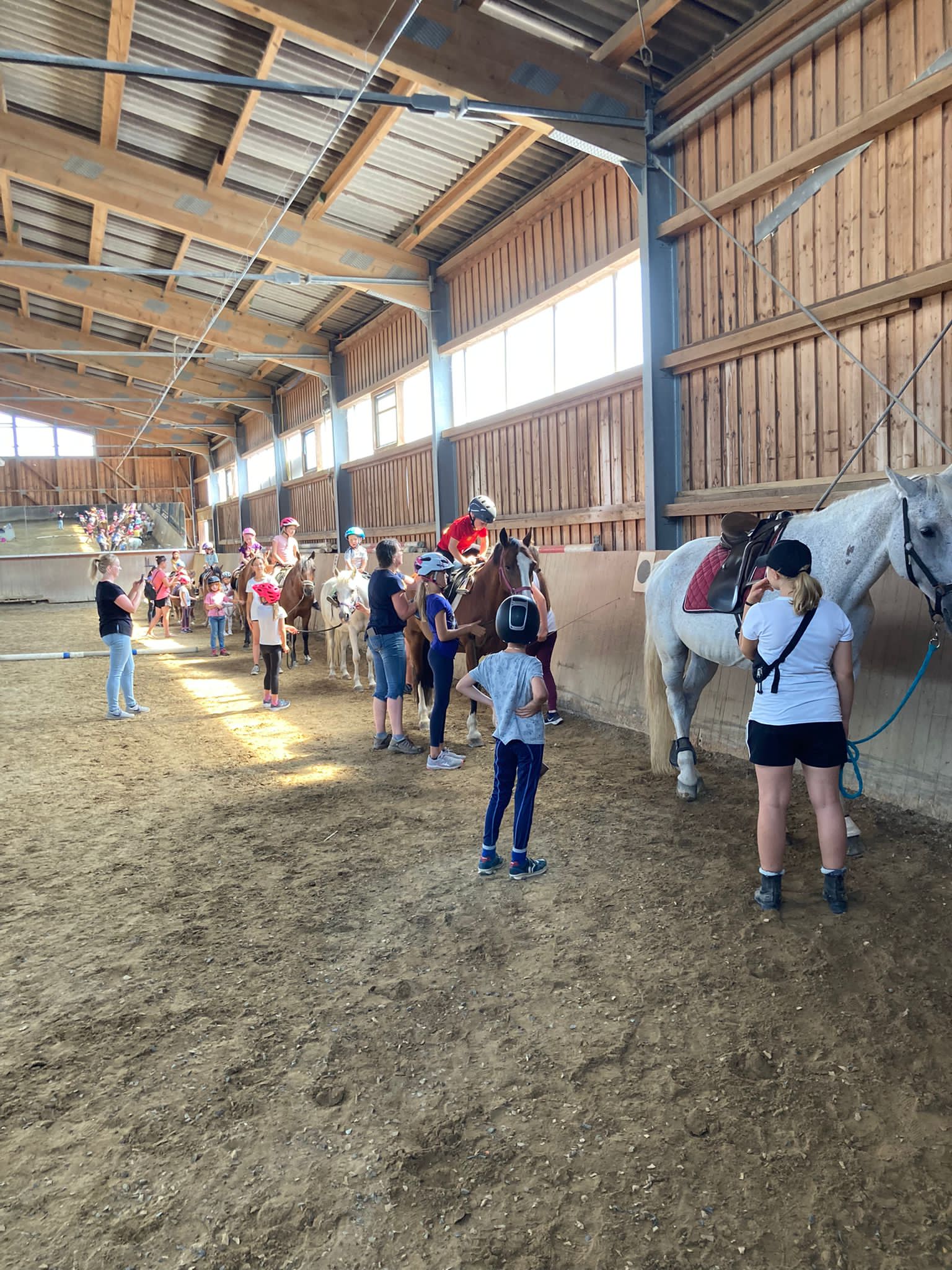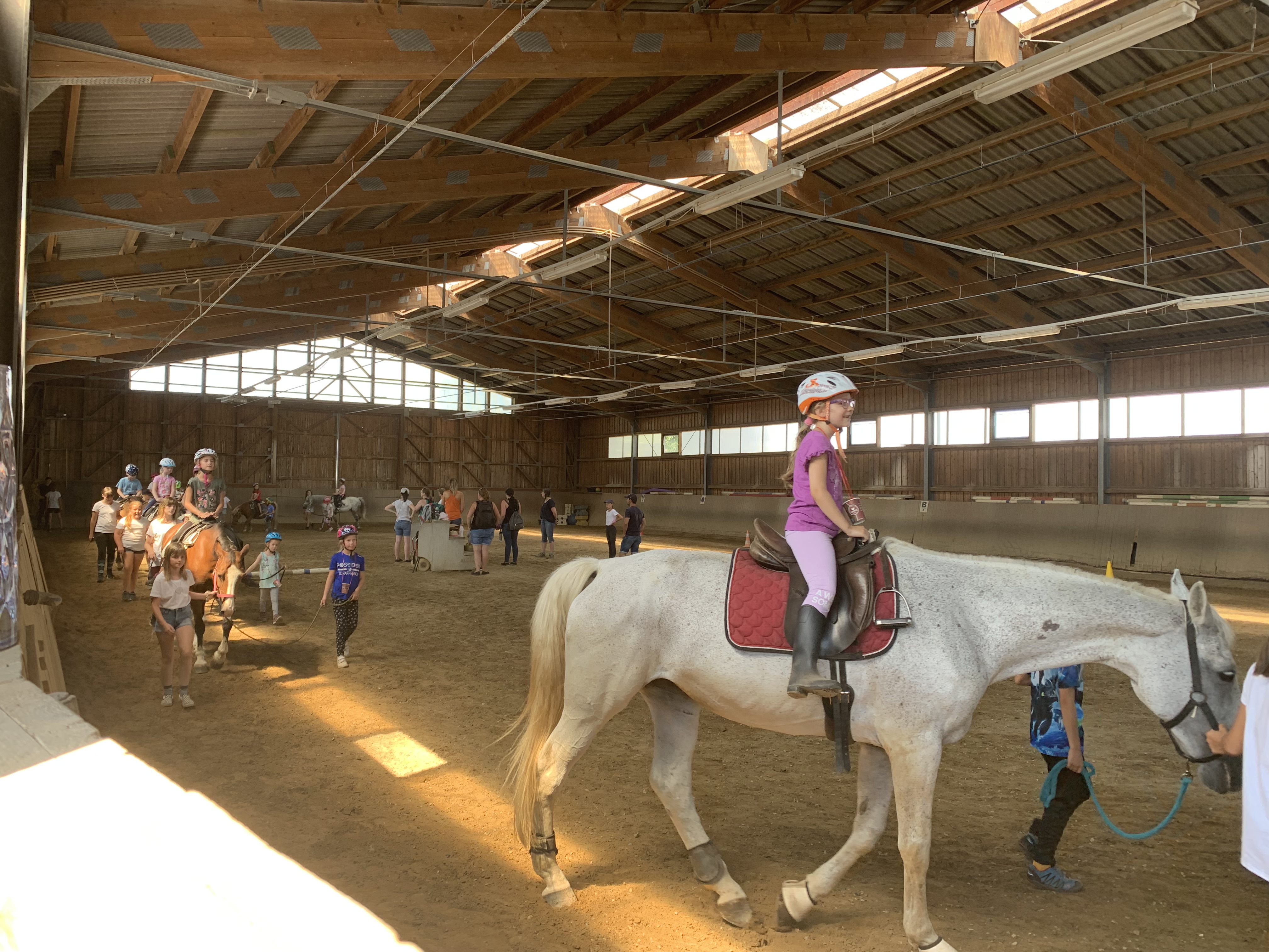 Am Mittwoch, den 10.08.2022, nahmen 99 Kinder an der Ferienspielgemeinschaftsveranstaltung der Brückengemeinden im Reitstall Lindenhof in Niedernberg teil. In sechs Gruppen lernten die Teilnehmer an verschiedenen Stationen den Reiterhof und die dort lebenden Tiere kennen, zu denen zum Beispiel Pferde, Schweine, Hühner, Esel, Schafe und Hunde zählen. Zu jedem dieser Tiere haben die Teilnehmer Interessantes erfahren. Es gab Brote zur Stärkung. Die Teilnehmer durften voltigieren und ein Ritt auf den Pferden durfte natürlich auch nicht fehlen. Außerdem gab es einen Barfußpfad, über den die Kinder laufen konnten. Bei einer Planwagenfahrt um den Lindenhof herum konnten sich die Kinder etwas ausruhen und den Blick auf die Felder genießen.