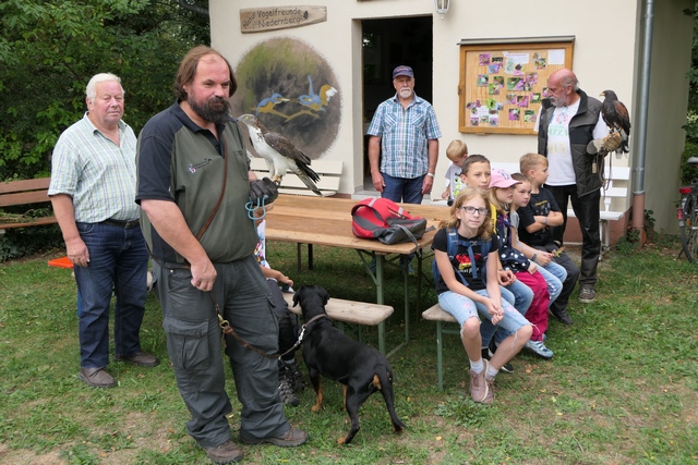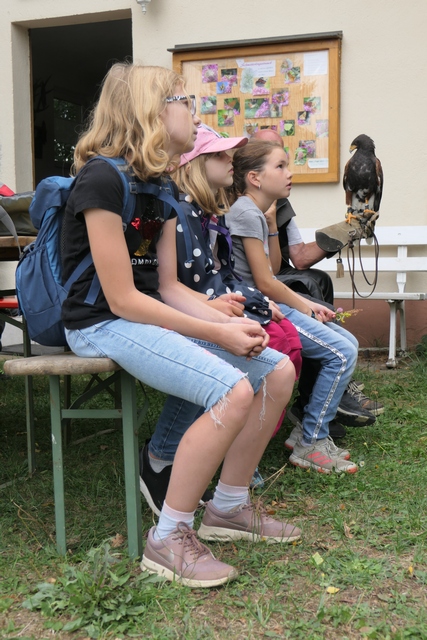 Einer davon war eindeutig ein Kurzschwänziger Bläuling, der noch vor einigen Jahren einen hohen Seltenheitsstatus aufwies. Von der Wanderung zurück, erwarteten uns bereits Herr Michael Mendel und "Lobo" mit einem Wespenbussard und einem Wüstenbussard aus der Greifvogelauffangstation in Klingenberg. Während Herr Mendel uns Erläuterungen zu Greifvögeln und deren Lebensweise gab, ließ sich "Lobo" über die Besonderheiten unserer heimischen Eulen aus. Nachdem die Kinder und auch wir als Helfer uns anschließend mit einer kleinen Vesper gestärkt hatten, zogen es einige Kinde vor, ein von "Lobo" selber entwickeltes Kreuzworträtsel zu lösen.