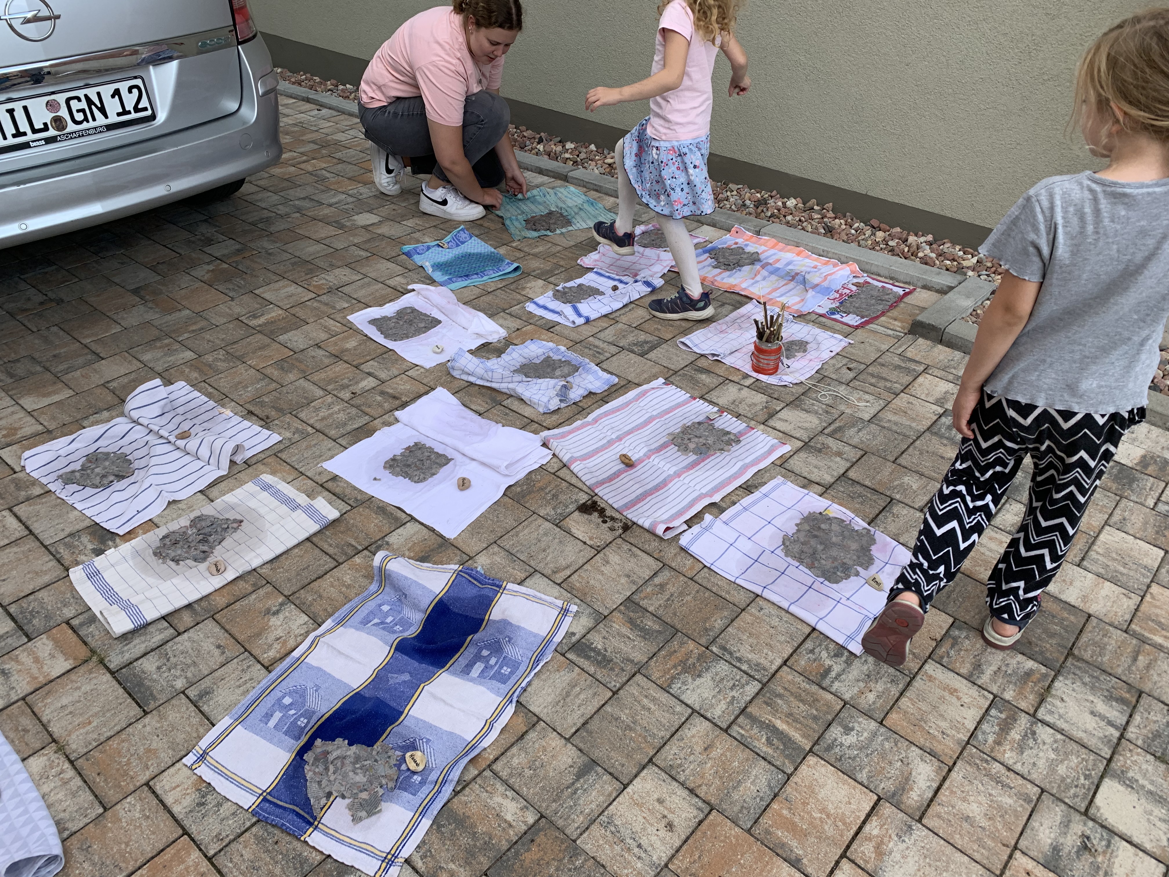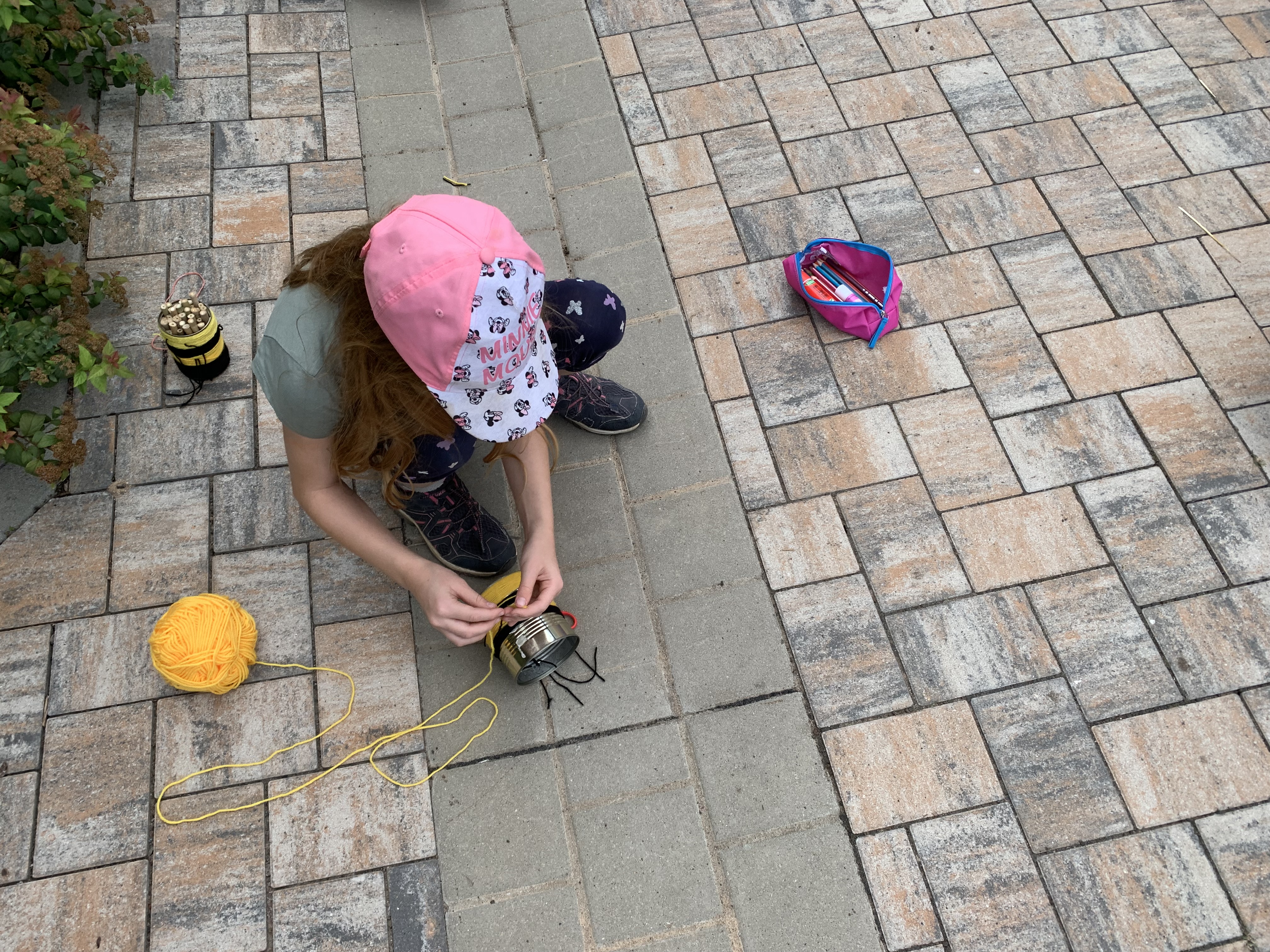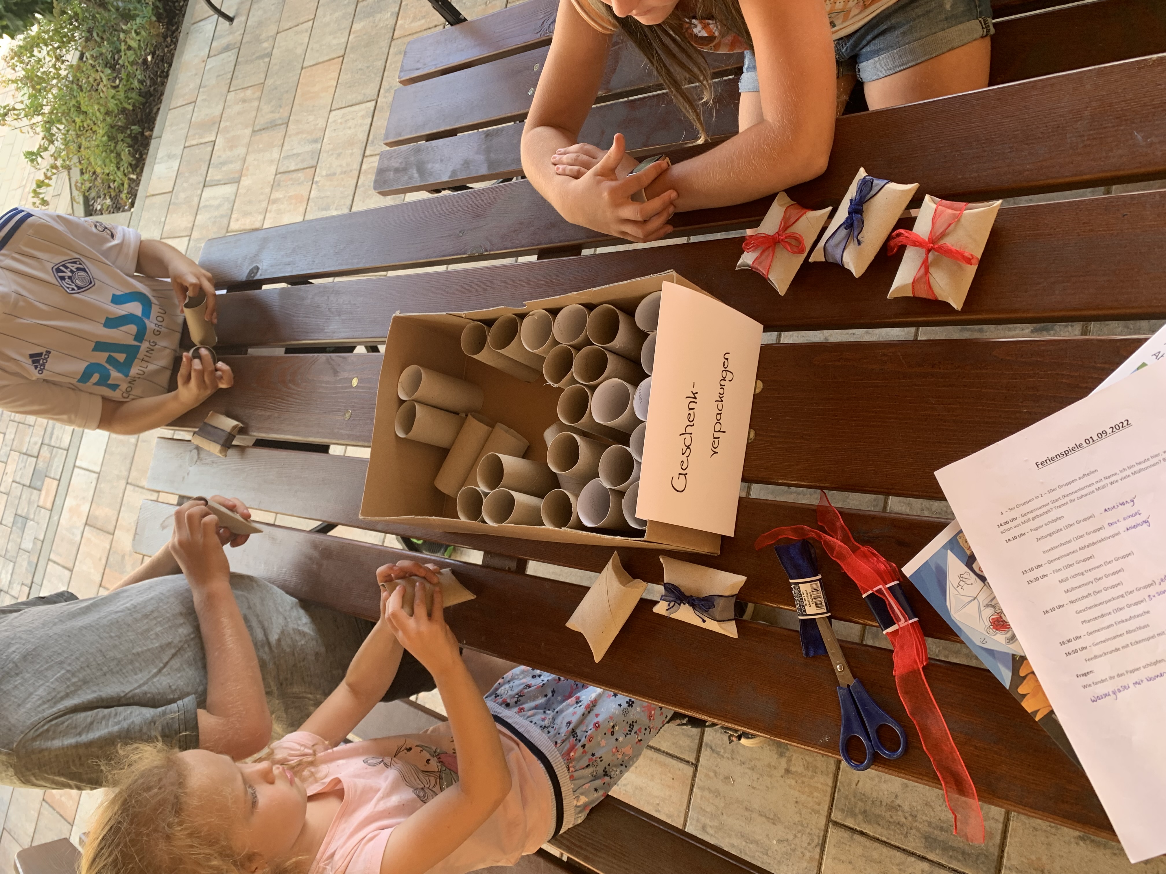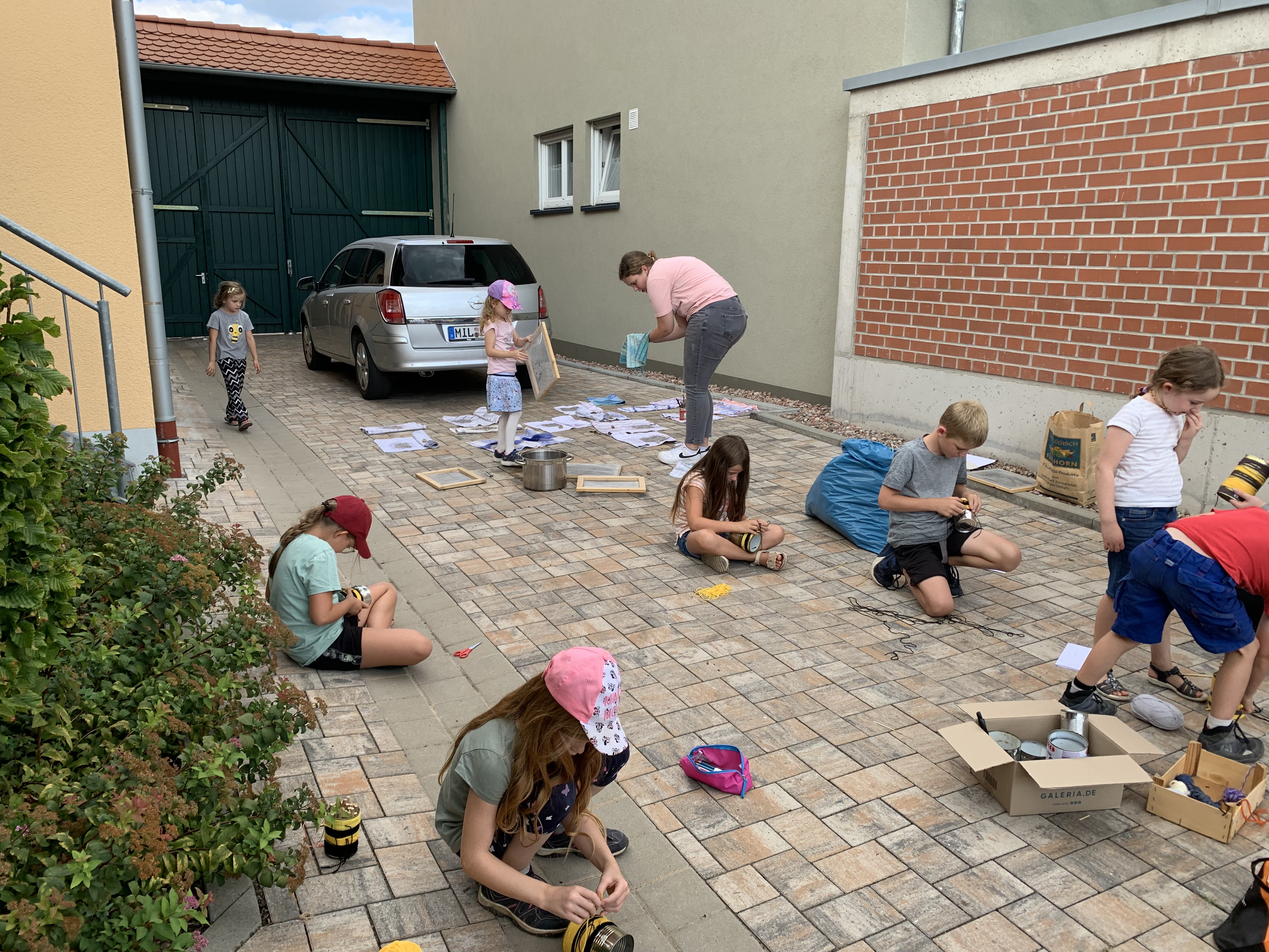 Nach einer kurzen Vorstellungsrunde begannen die Kinder mit dem Basteln eines Insektenhotels aus einer alten Konservendose; diese nahm anschließend die Gestalt einer Biene an. Durch das Schöpfen von eingeweichten Zeitungen durfte sich jedes Kind ein neues Stück dickes Papier herstellen. Außerdem falteten die Kinder aus Klopapierrollen eine Geschenkschachtel.