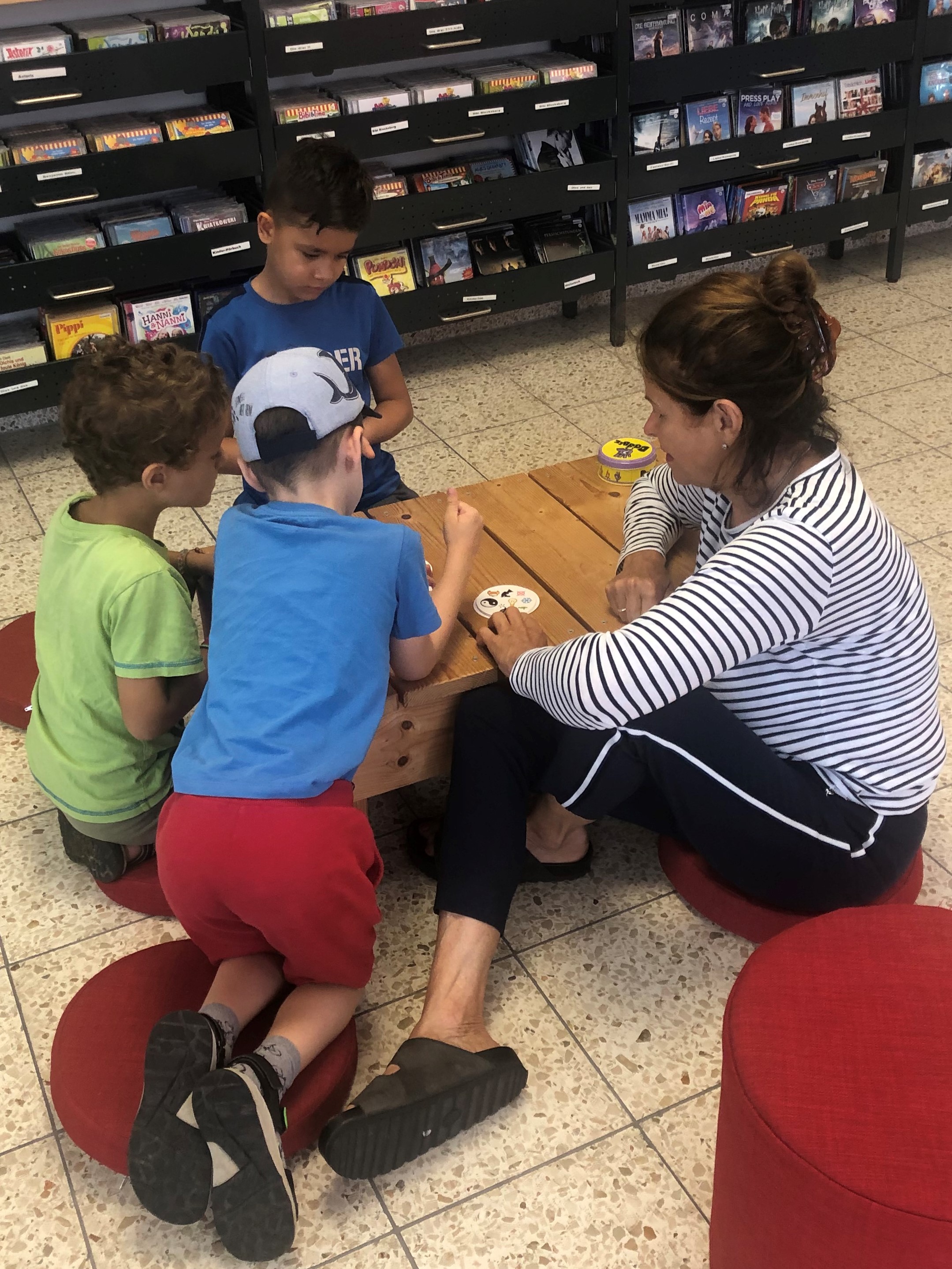 Gut gelaunt haben sich am 17. August 16 Kinder und 4 Erwachsene getroffen um einen gemütlichen Spiele-Vormittag in der Bücherei zu verbringen. Schnell haben sich kleine Gruppen gebildet, die sich über das große Spielesortiment der Bücherei freuten. Geduldig ließen sich die Kinder neue Spiele von den Erwachsenen oder anderen Kindern erklären.