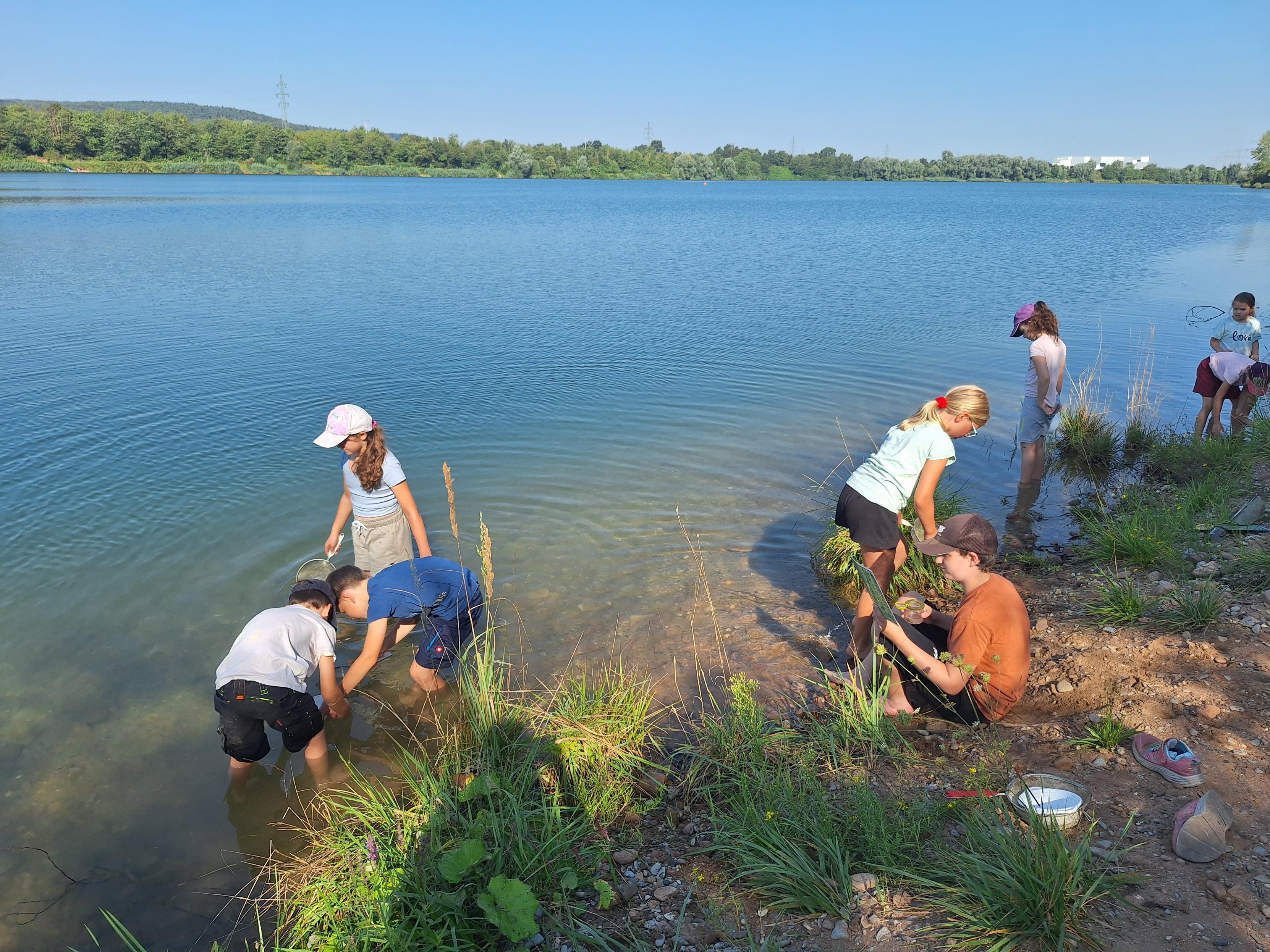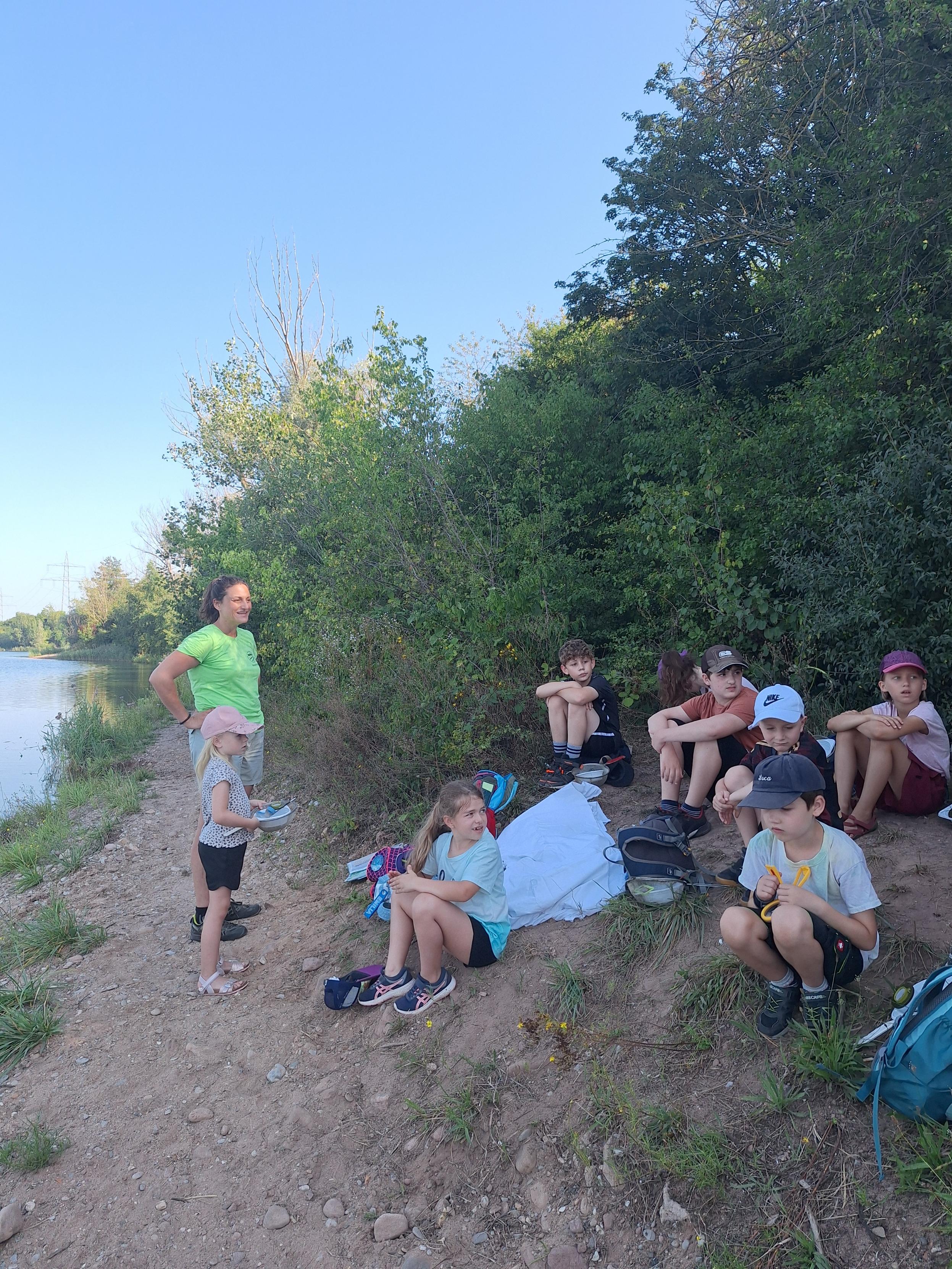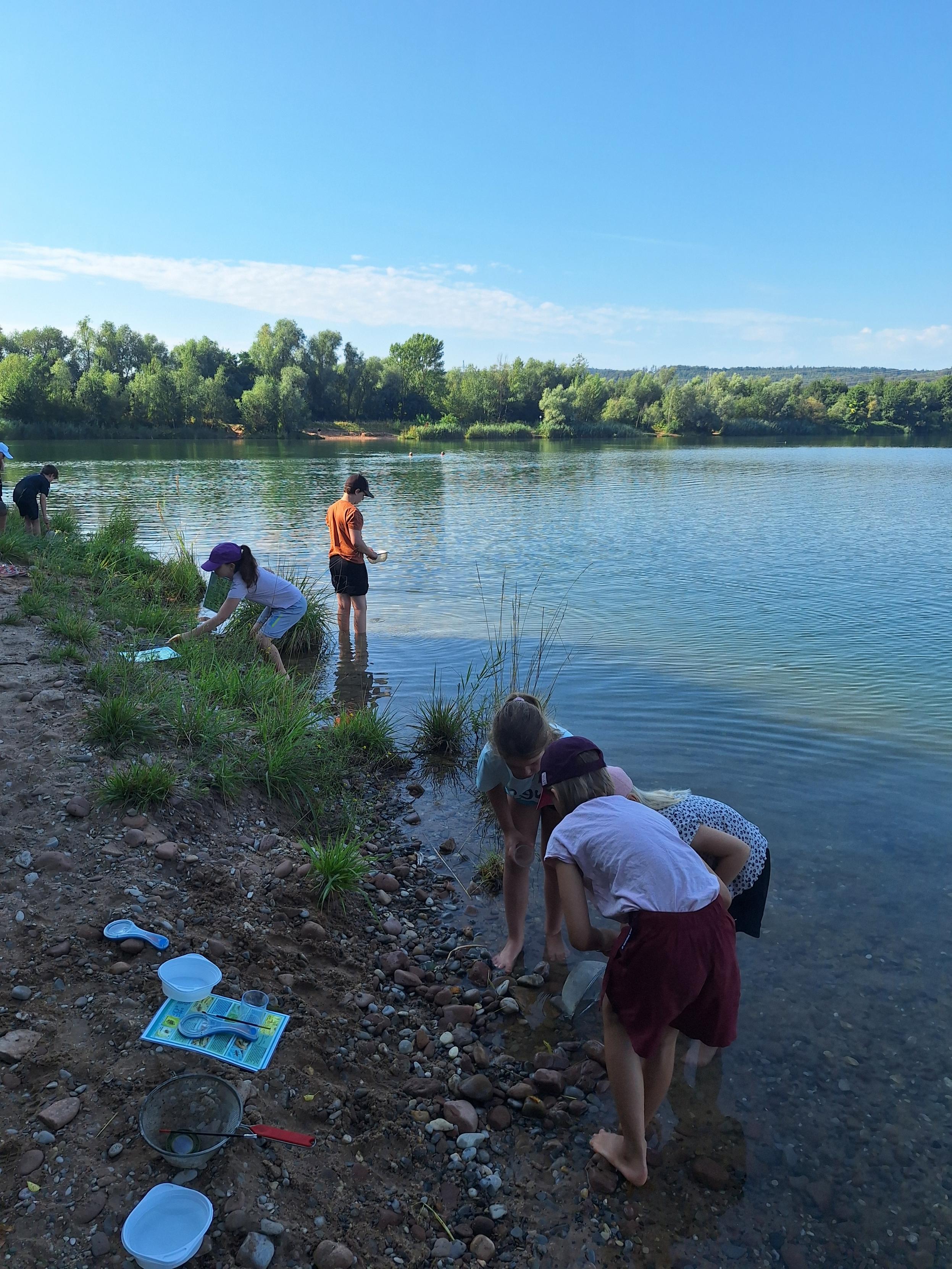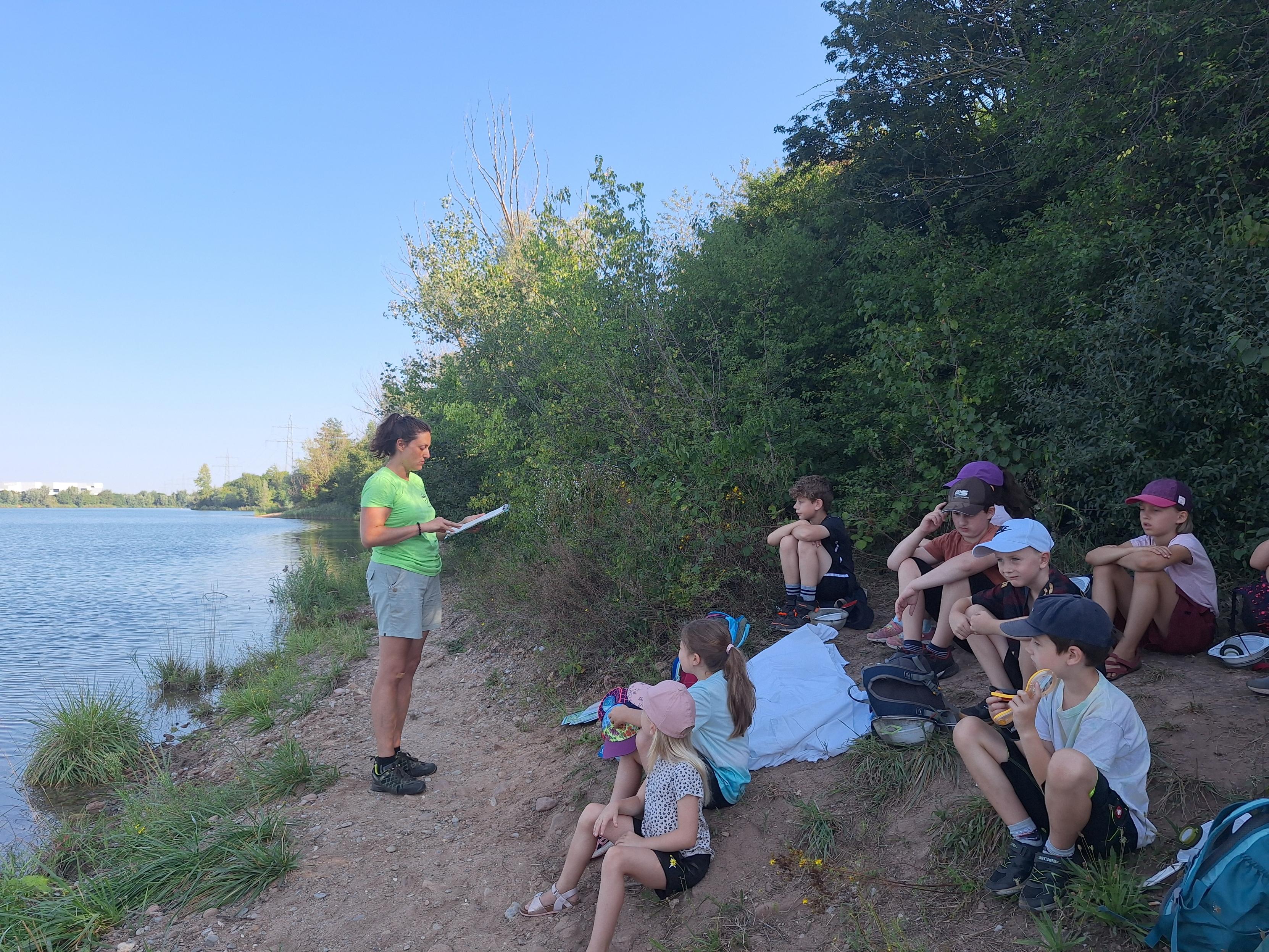 Am See angekommen haben die Kinder bei einer Runde „Naseweis“ die Wald- und Seebewohner besser kennengelernt. Danach ging es auch schon ab ins Wasser, wo mit Sieb und Lupendose am Ufer nach kleinen Tierchen gesucht wurde. Nach einer kleinen Picknick-Pause durften die Kinder viele interessante Spiele wie „Nahrungsnetz“, „Frösche und Fliegen“ und „Pflanzen-Memory“ spielen um so die örtlichen Wald- und Seenbewohner besser zu verstehen.Dann ging es auch schon wieder Richtung Parkplatz der Hans-Herrmann-Halle, wo die Eltern schon auf die Kinder warteten. Nach einer anschließenden Feedbackrunde war es auch schon vorbei. Das Feedback war sehr positiv, allen hat es viel Spaß gemacht.