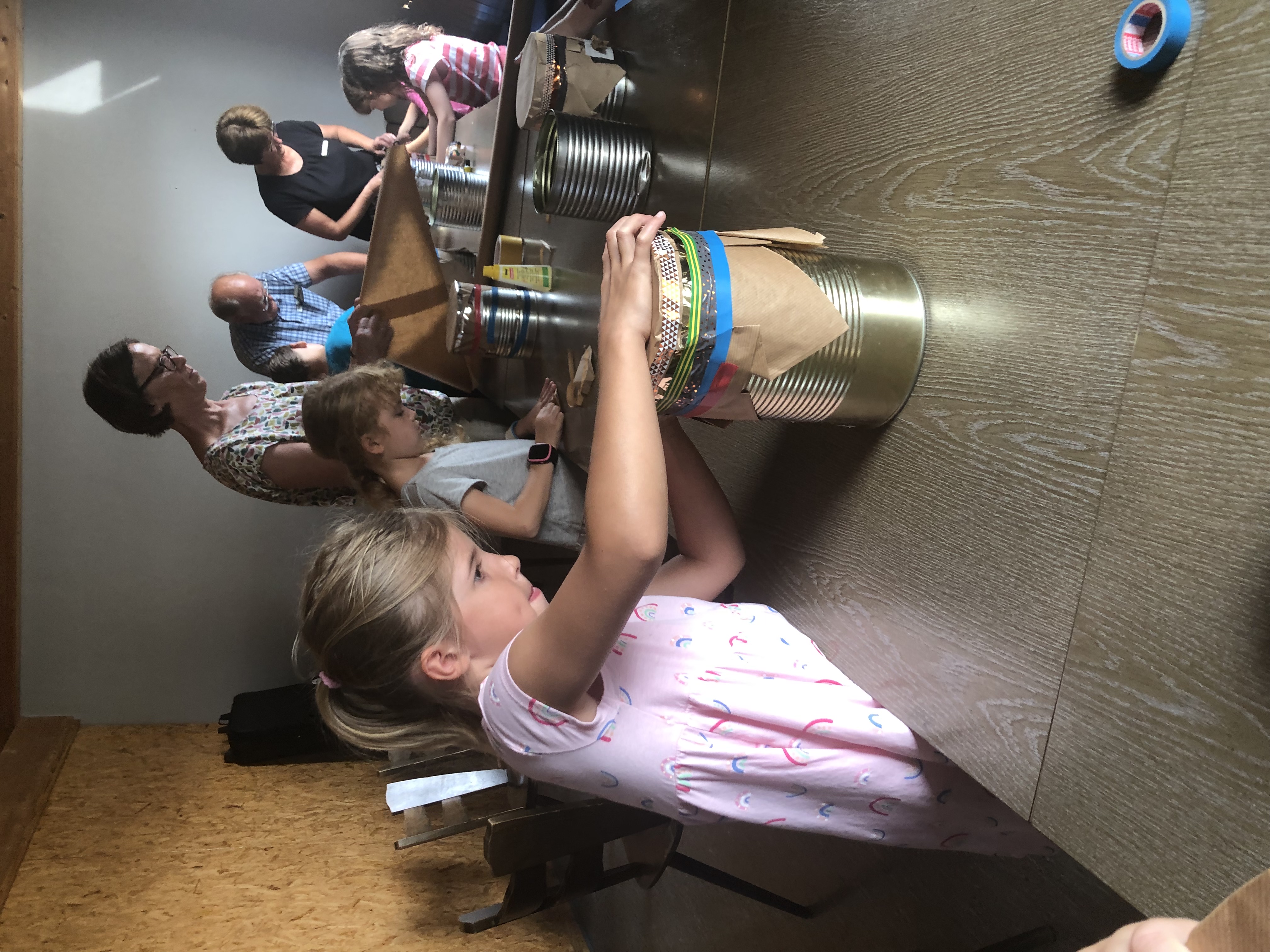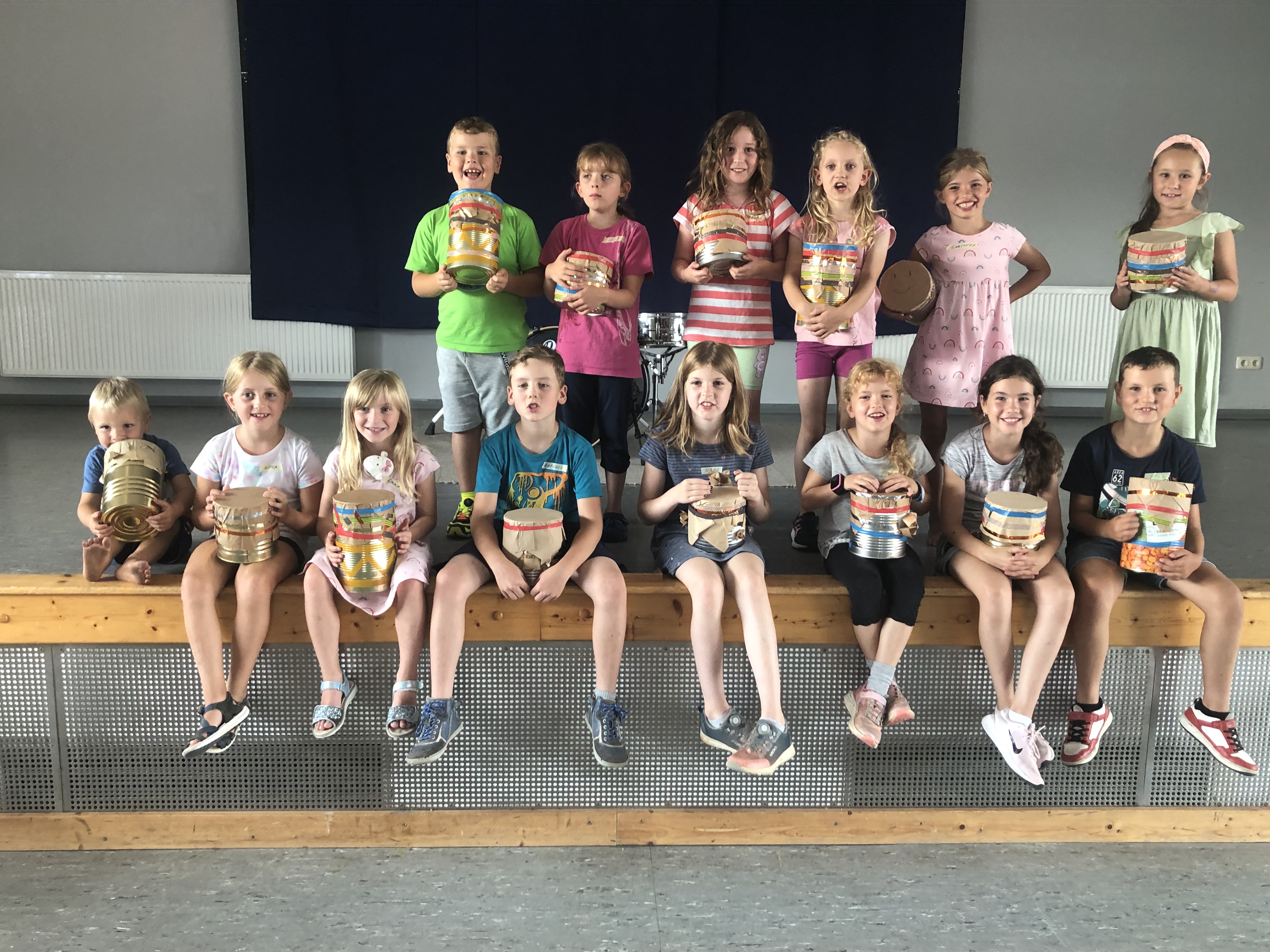 Nach einer Trinkpause kommt der kreative Teil. Aus Blechdosen (Vielen Dank an die Metzgerei Mohr) basteln wir mit Packpapier und Klebebbändern Trommeln. Alle Kinder sind voller Eifer mit dabei und so können wir anschließend gemeinsam Trommeln. Jede/r gibt einen Takt vor, wir trommeln ein Gewitter und eine Trommelgeschichte vom „Trommelkönig“. Danach brauchen wir noch einmal eine Pause etwas zu trinken und knabbern und zum Abschluss und Ausklang singen wir das Quodlibet, weil es so schön geklungen hat.