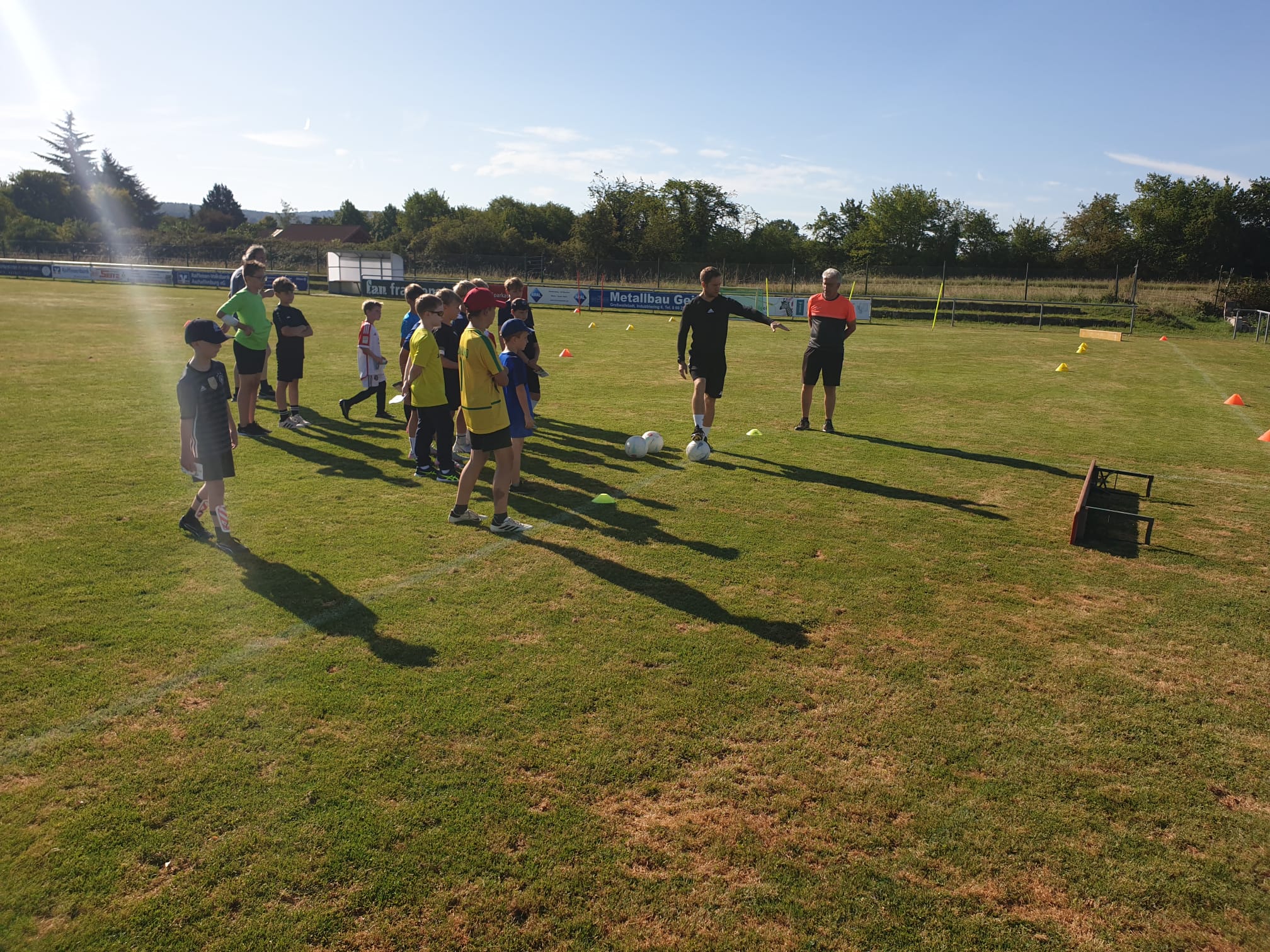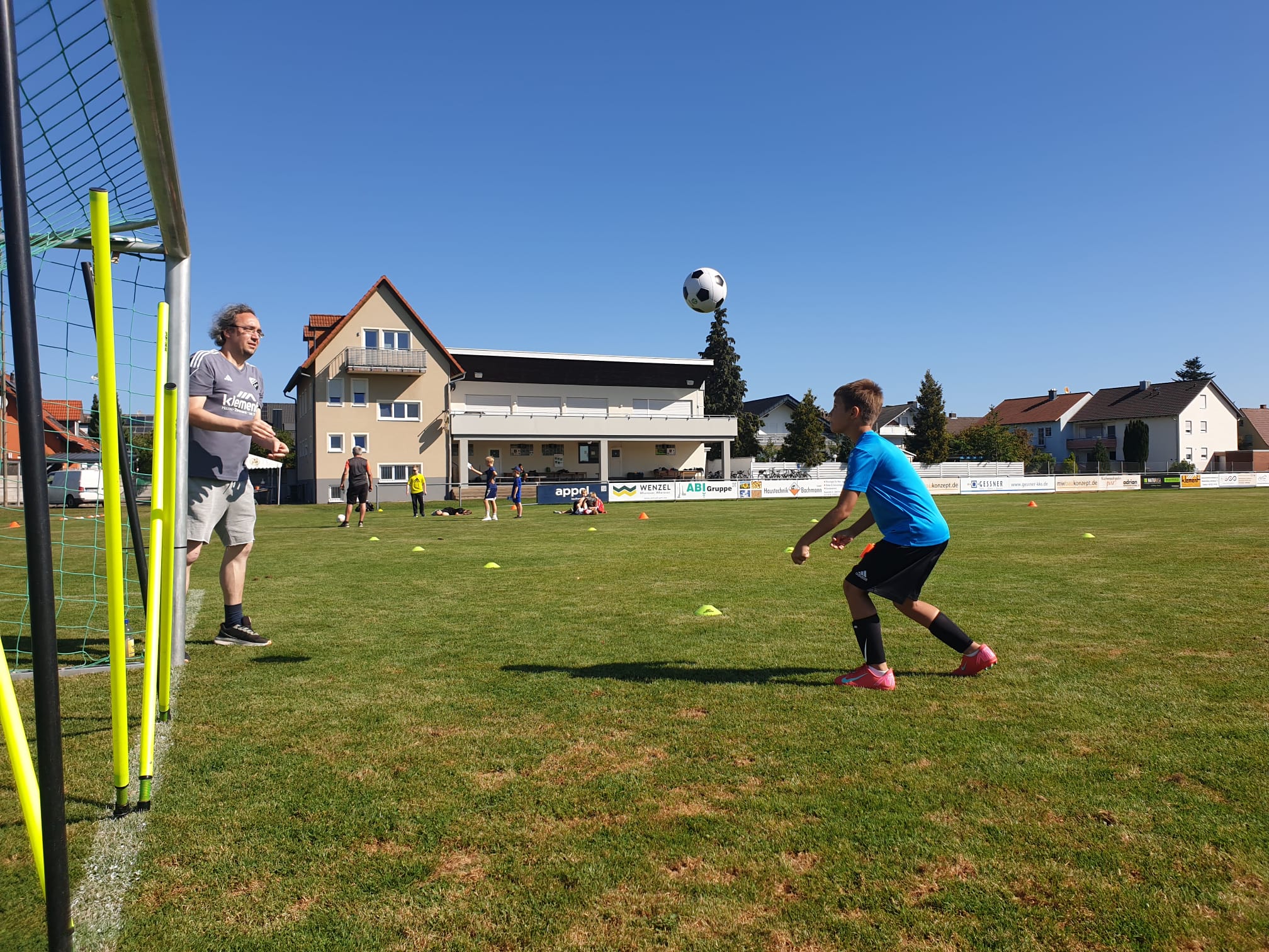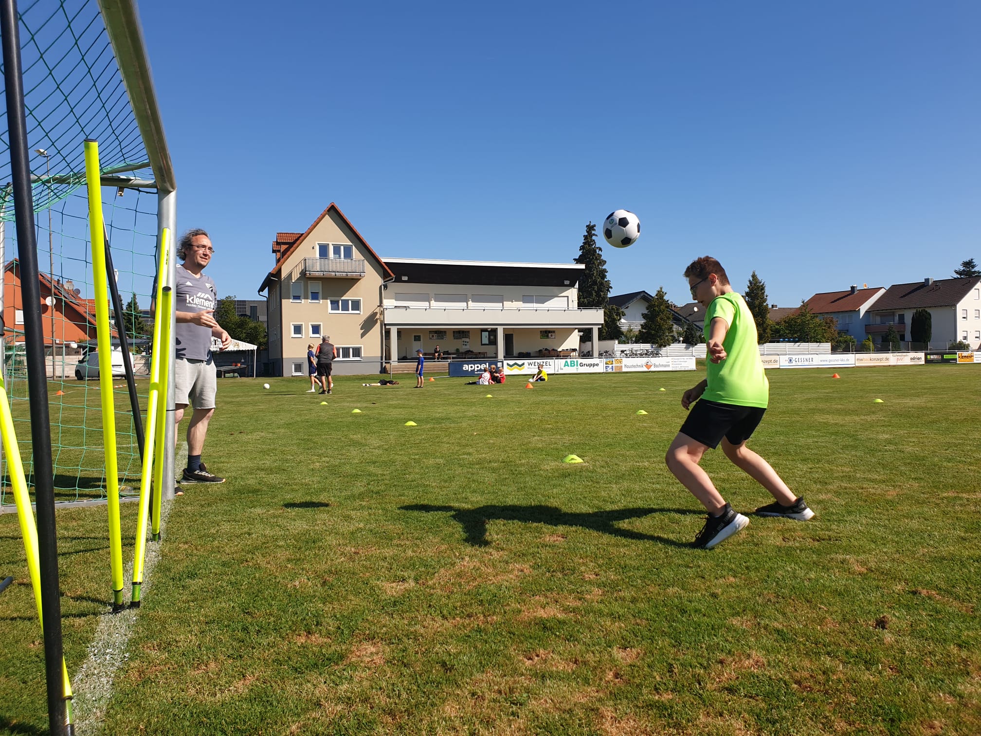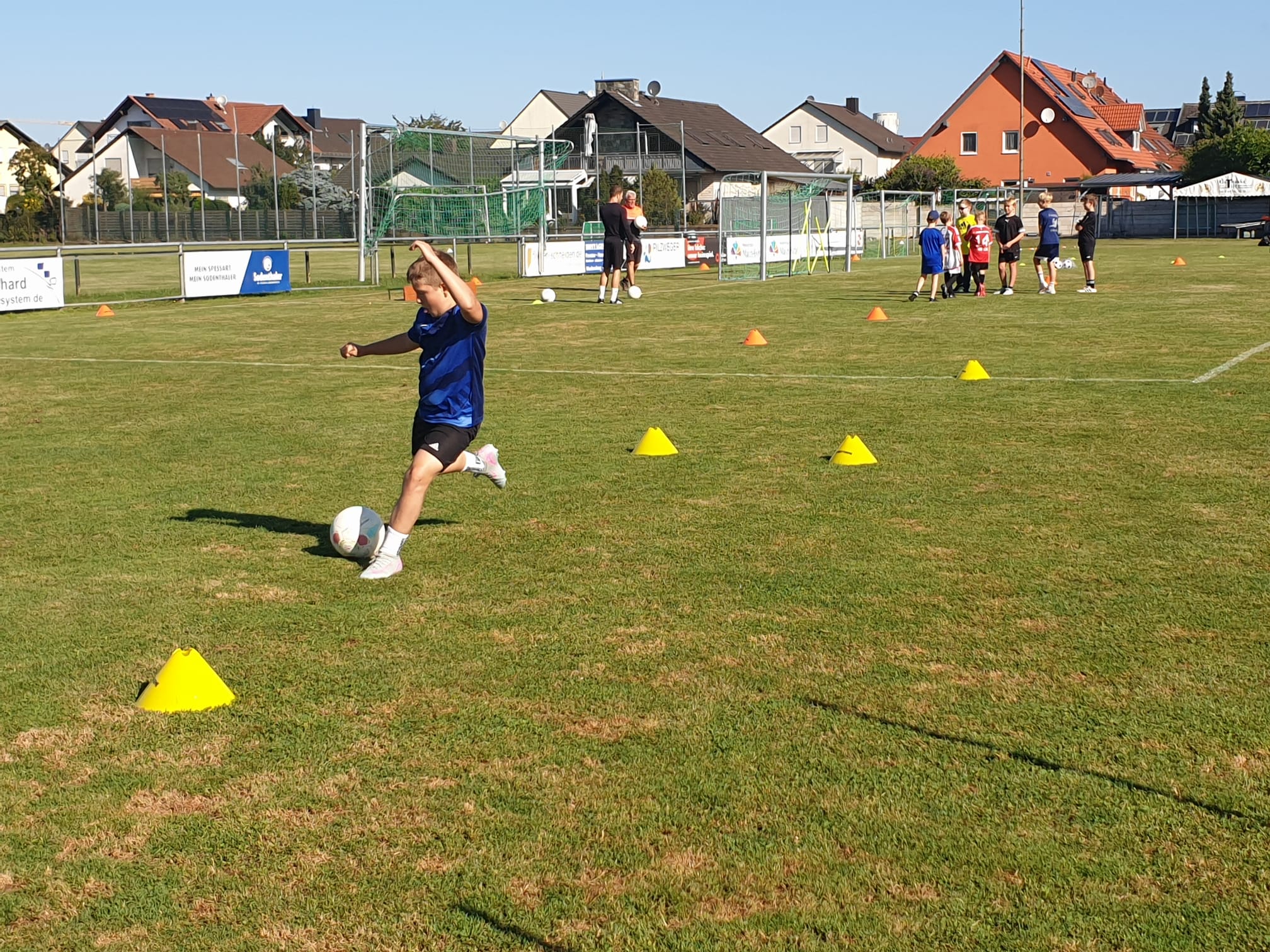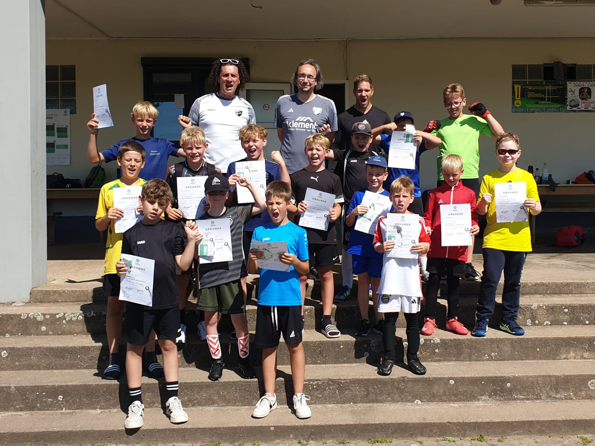 Am 18.08.25, hatten 15 Kinder die Möglichkeit ihr Können mit dem Ball unter Beweis zu stellen. Insgesamt gab es 5 Stationen, die unterschiedlich gemeistert werden mussten. Es gab drei mögliche Urkunden zu erreichen. Je nachdem wie viele Punkte die Kids in den Disziplinen erreicht haben, konnten Sie eine der drei Urkunden überreicht bekommen. Darunter befand sich eine Station, wo die Kopfballfähigkeit getestet wurde. Anschließend ging es weiter mit mit dem „Elferkönig“, wo die Kids aus 9 Metern das Leder ins Eckige schießen mussten. Je nach dem, wo der Ball ins Tor traf, gab es eine unterschiedliche Punktzahl. Weiter ging es mit ein paar Flanken. Hier mussten die Kids aus ca. 15 Metern den Ball in einen gewissen Bereich flanken, ohne das der Ball zuvor den Boden berührt. Nun ging es weiter mit einer Passübung. Dort musste man innerhalb von 30 Sekunden den Ball so oft wie möglich, gegen eine Holzbank passen. Allerdings musste die Kraft gut gewählt sein, ansonsten kam der Ball nicht wieder zurück und man verlor wichtige Sekunden, wenn man den Ball zurückholen musste. Bei der letzten Station wurden mehrere Fähigkeiten getestet. Beim sogenannten „Dribbelkönig“ mussten die Kids einen Parcours mit dem Ball absolvieren und den Ball am Ende noch im Tor verwandeln. Für die volle Punktzahl musste man den Parcours in 17 Sekunden absolvieren. Das ist ganz schön schnell und wir hatten sogar zwei dabei, die diese Zeit gemeistert haben. Saubere Leistung!!
