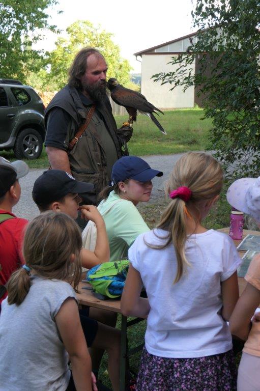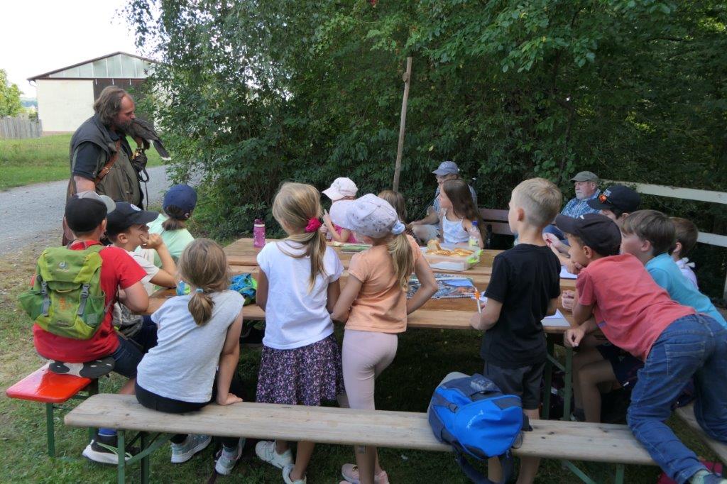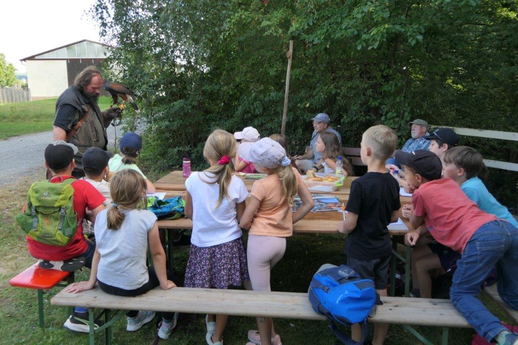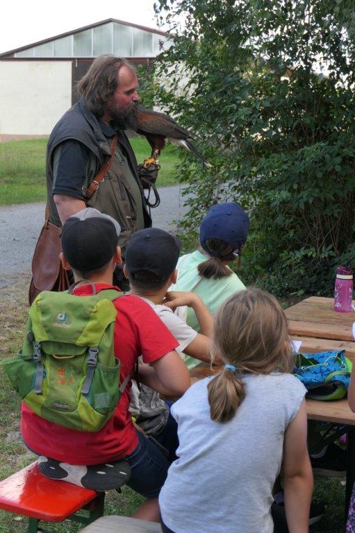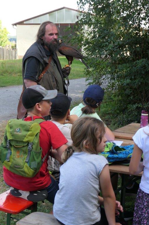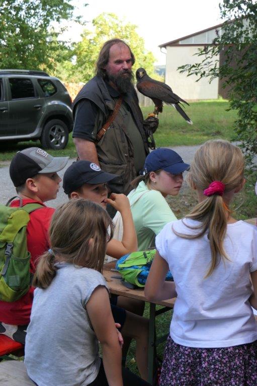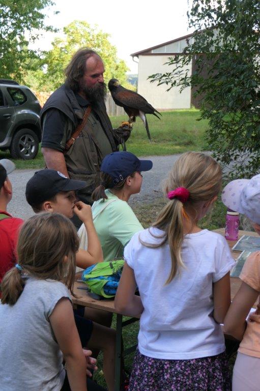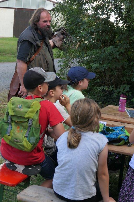 Am Anfang unserer Veranstaltung unternahmen wir mit 15 Kindern und 6 Betreuern eine kurze Wanderung rund um den Sandhäger (ehemalige Obstplantage). Hierbei legten wir kurze Stopps an den 2 Insektenhotels und der Hirschkäferwiege ein, um einige Erläuterungen und Erklärungen hierzu anzubringen. Im zweiten, zeitlich größeren, Abschnitt konnten wir dann unseren Gast Herrn Michael Mendel begrüßen, der uns einen Wüstenbussard mitgebracht hatte. Michael Mendel ist Falkner und betreut die Greifvogelauffangstation in Klingenberg. Er erklärte uns unter anderem, warum Eulen im Vergleich zu den tagaktiven Greifvögeln, geräuschlos fliegen und wie sie ihre Beute, meist Mäuse, lokalisieren, um diese problemlos zu erwischen. Weiterhin hatte er Federn von 5 verschiedenen Greifvögeln mitgebracht, die dann von den teilnehmenden Kindern den entsprechenden Fotos der Vögel zugeordnet werden sollten.