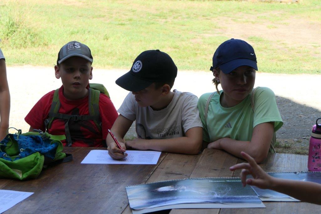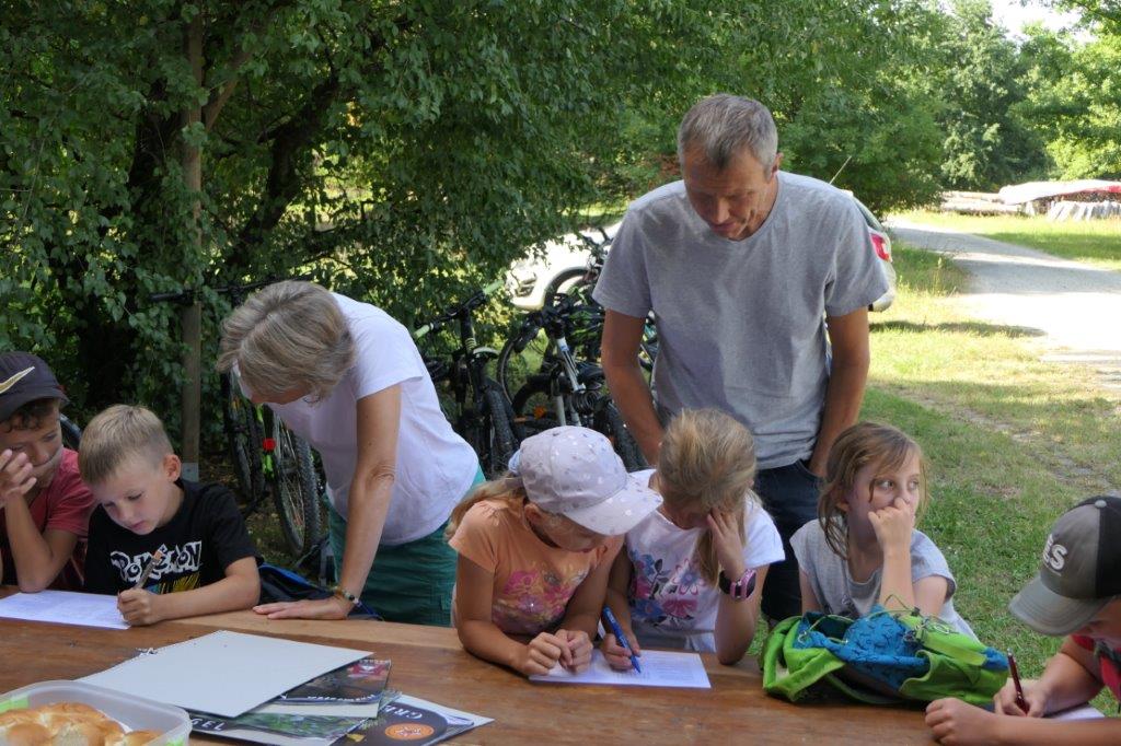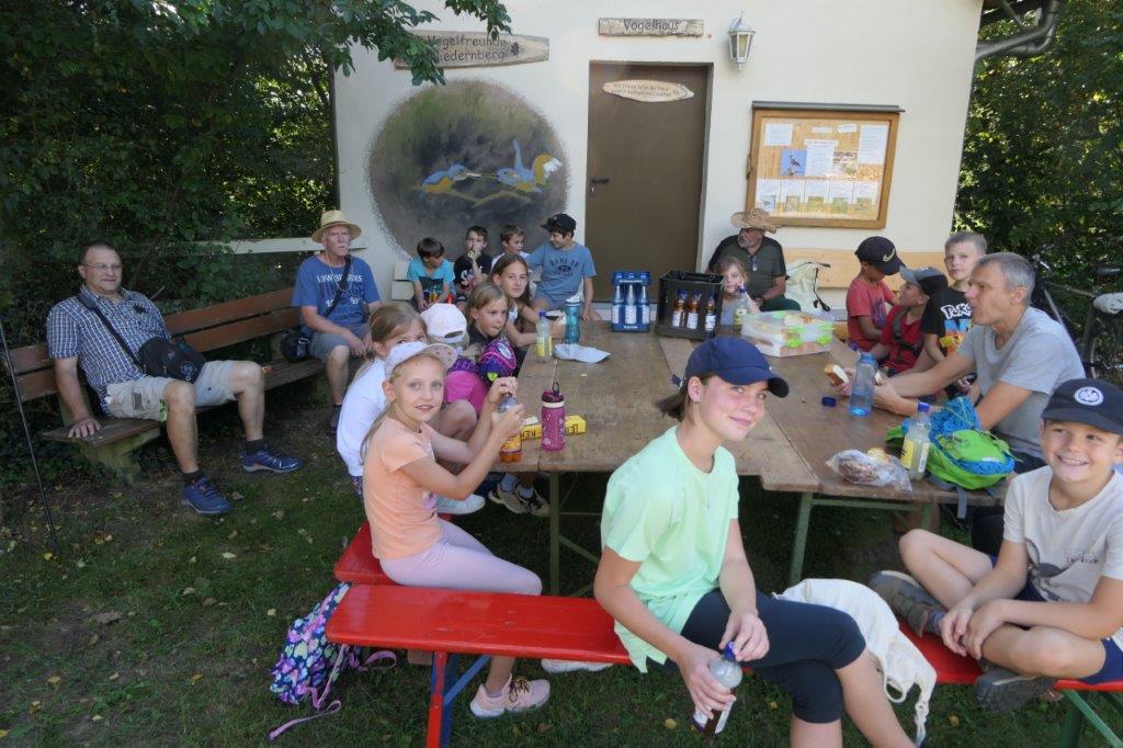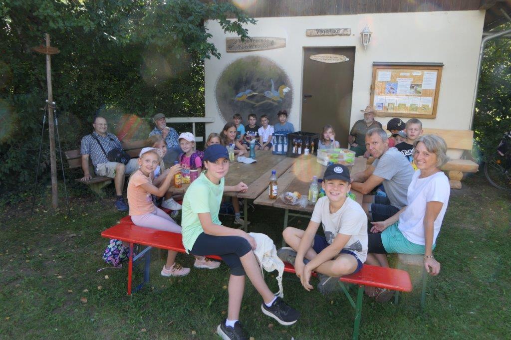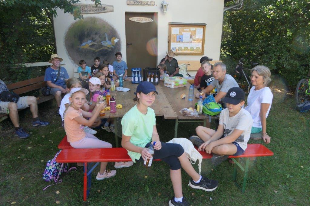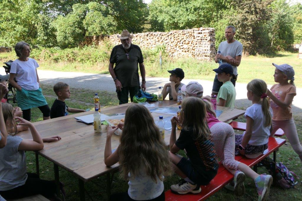 Am Anfang unserer Veranstaltung unternahmen wir mit 15 Kindern und 6 Betreuern eine kurze Wanderung rund um den Sandhäger (ehemalige Obstplantage). Hierbei legten wir kurze Stopps an den 2 Insektenhotels und der Hirschkäferwiege ein, um einige Erläuterungen und Erklärungen hierzu anzubringen. Im zweiten, zeitlich größeren, Abschnitt konnten wir dann unseren Gast Herrn Michael Mendel begrüßen, der uns einen Wüstenbussard mitgebracht hatte. Michael Mendel ist Falkner und betreut die Greifvogelauffangstation in Klingenberg. Er erklärte uns unter anderem, warum Eulen im Vergleich zu den tagaktiven Greifvögeln, geräuschlos fliegen und wie sie ihre Beute, meist Mäuse, lokalisieren, um diese problemlos zu erwischen. Weiterhin hatte er Federn von 5 verschiedenen Greifvögeln mitgebracht, die dann von den teilnehmenden Kindern den entsprechenden Fotos der Vögel zugeordnet werden sollten.