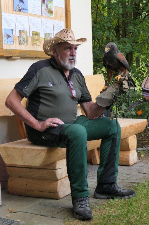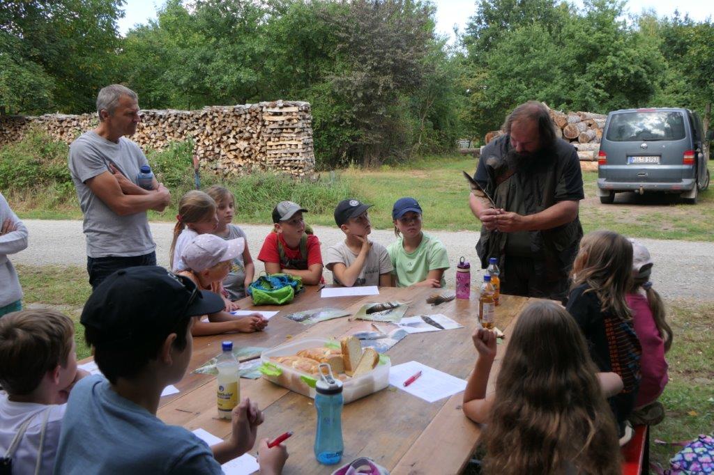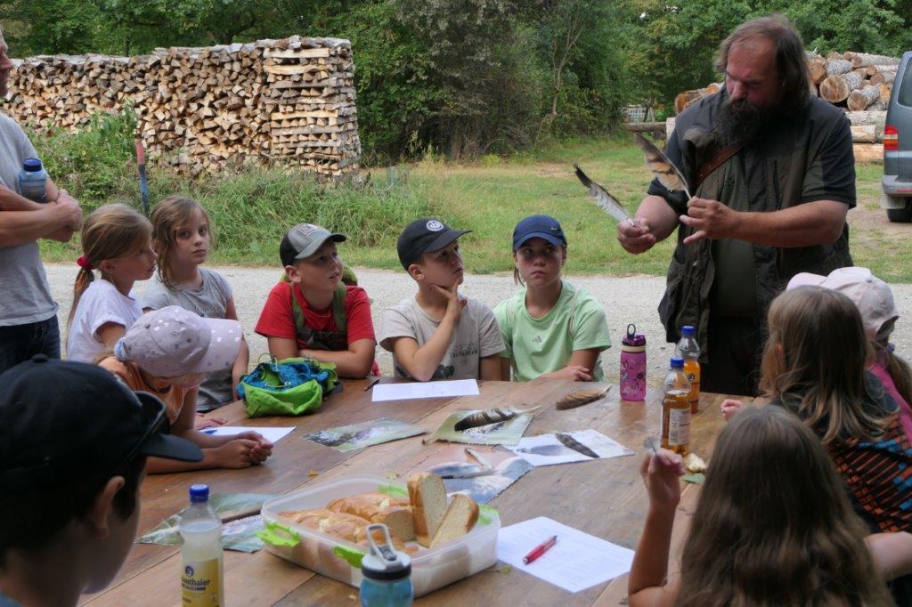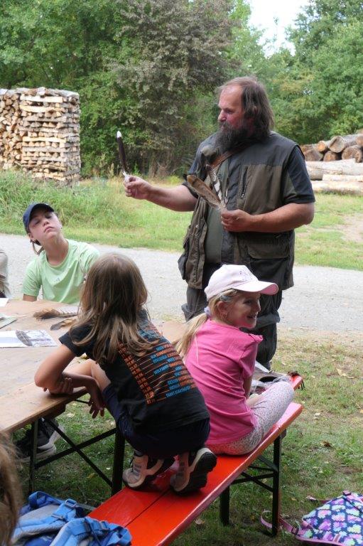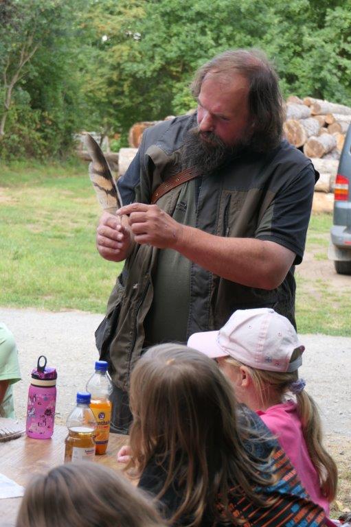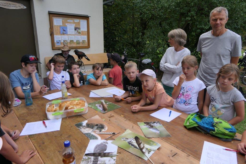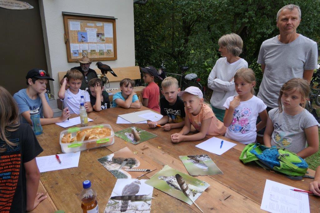 Am Anfang unserer Veranstaltung unternahmen wir mit 15 Kindern und 6 Betreuern eine kurze Wanderung rund um den Sandhäger (ehemalige Obstplantage). Hierbei legten wir kurze Stopps an den 2 Insektenhotels und der Hirschkäferwiege ein, um einige Erläuterungen und Erklärungen hierzu anzubringen. Im zweiten, zeitlich größeren, Abschnitt konnten wir dann unseren Gast Herrn Michael Mendel begrüßen, der uns einen Wüstenbussard mitgebracht hatte. Michael Mendel ist Falkner und betreut die Greifvogelauffangstation in Klingenberg. Er erklärte uns unter anderem, warum Eulen im Vergleich zu den tagaktiven Greifvögeln, geräuschlos fliegen und wie sie ihre Beute, meist Mäuse, lokalisieren, um diese problemlos zu erwischen. Weiterhin hatte er Federn von 5 verschiedenen Greifvögeln mitgebracht, die dann von den teilnehmenden Kindern den entsprechenden Fotos der Vögel zugeordnet werden sollten.