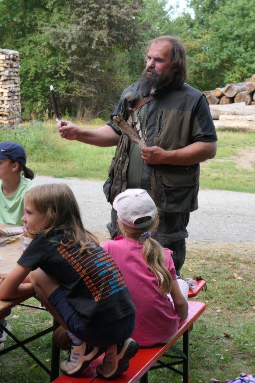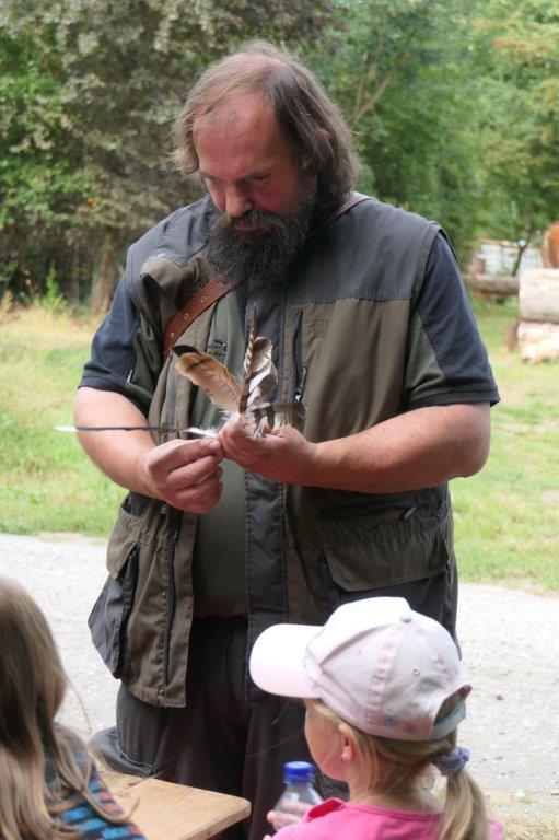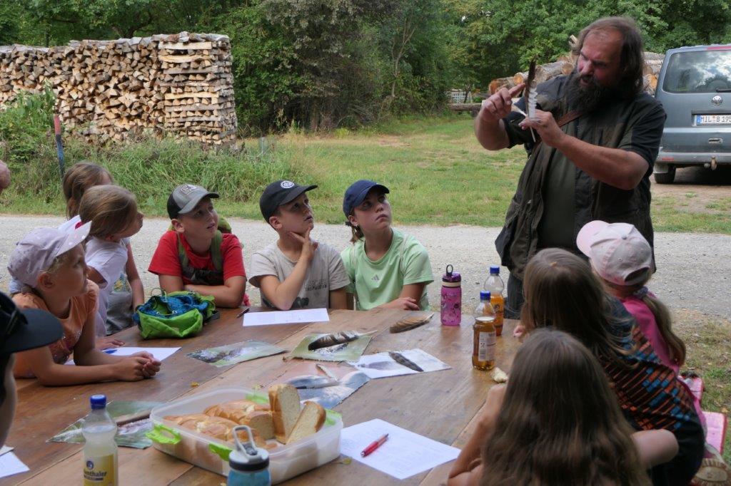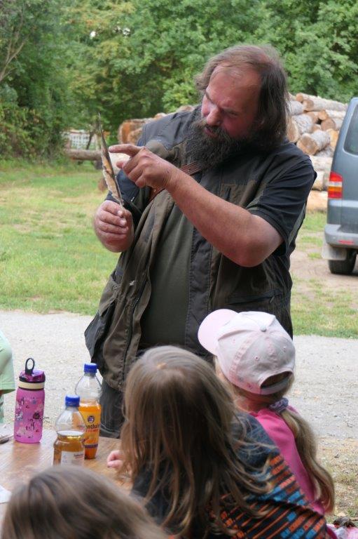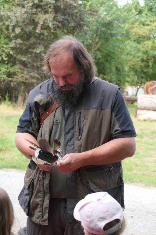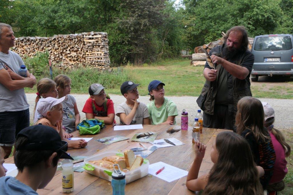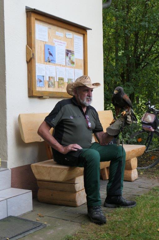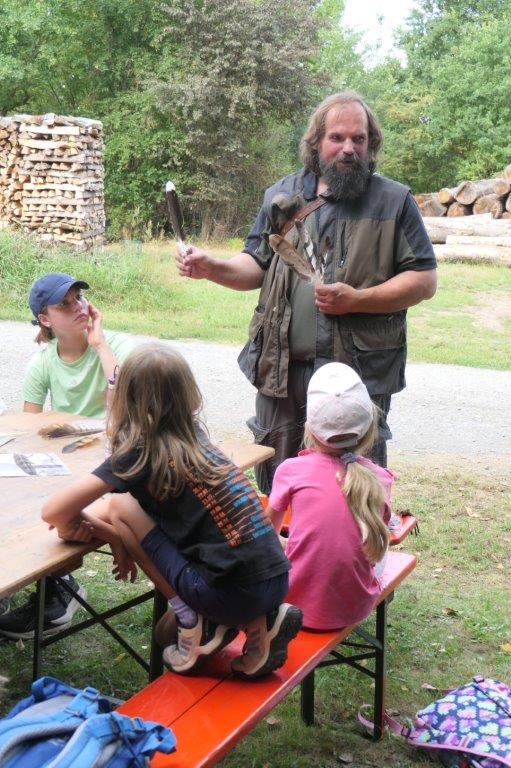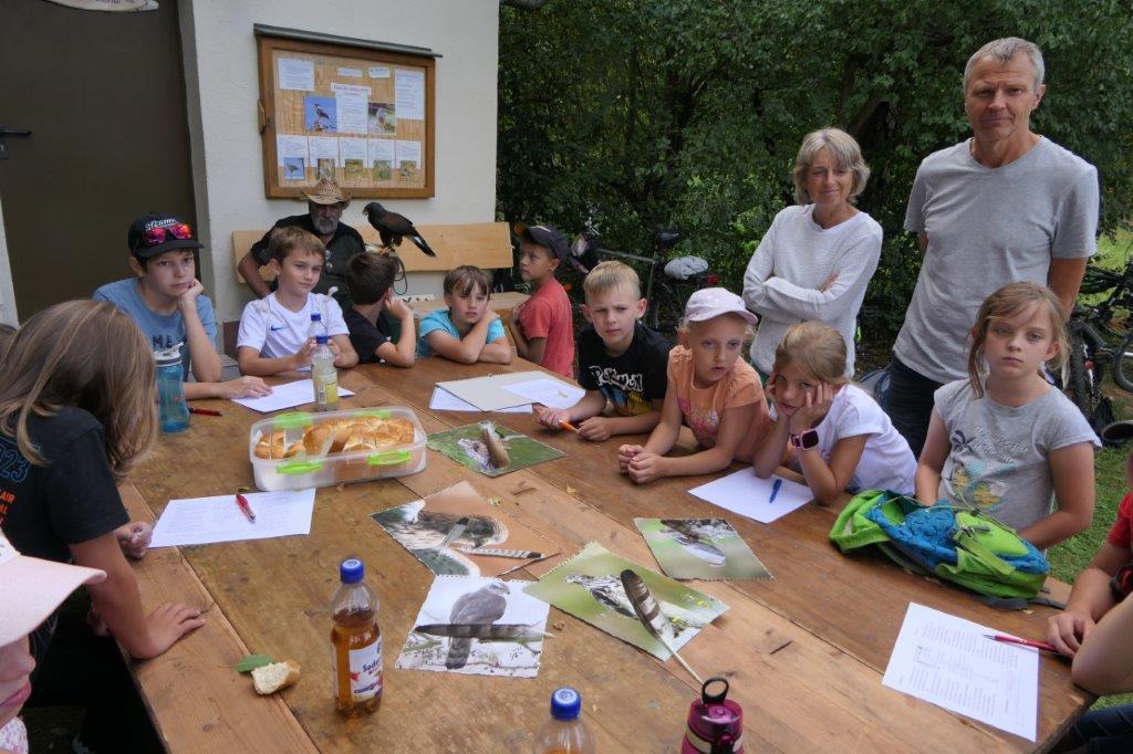 Am Anfang unserer Veranstaltung unternahmen wir mit 15 Kindern und 6 Betreuern eine kurze Wanderung rund um den Sandhäger (ehemalige Obstplantage). Hierbei legten wir kurze Stopps an den 2 Insektenhotels und der Hirschkäferwiege ein, um einige Erläuterungen und Erklärungen hierzu anzubringen. Im zweiten, zeitlich größeren, Abschnitt konnten wir dann unseren Gast Herrn Michael Mendel begrüßen, der uns einen Wüstenbussard mitgebracht hatte. Michael Mendel ist Falkner und betreut die Greifvogelauffangstation in Klingenberg. Er erklärte uns unter anderem, warum Eulen im Vergleich zu den tagaktiven Greifvögeln, geräuschlos fliegen und wie sie ihre Beute, meist Mäuse, lokalisieren, um diese problemlos zu erwischen. Weiterhin hatte er Federn von 5 verschiedenen Greifvögeln mitgebracht, die dann von den teilnehmenden Kindern den entsprechenden Fotos der Vögel zugeordnet werden sollten.